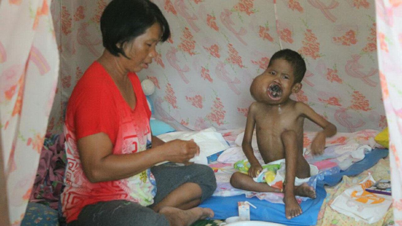นางสาวจันทร์แรม เล่าว่า เมื่อประมาณเดือนมกราคม 2557 ขณะที่ น้องแหยม วิ่งเล่นอยู่บนบ้าน ได้ประสบอุบัติเหตุล้มแก้มกระแทกพื้น มีรอยฟกช้ำ จากนั้นแผลลุกลามกลายเป็นมะเร็ง มีก้อนเนื้อร้ายขนาดใหญ่ทะลักโผล่ออกมาทางปากอย่างน่ากลัว เนื้อเยื่อบวมเข้าไปในลำคอ อีกทั้งแผลบางส่วนมีอาการเน่า จนไม่สามารถรับประทานอาหารได้ รับประทานได้เพียงแต่นมเท่านั้น ขณะที่การให้ยาฆ่าเชื้อ ยาลดไข้ ยาปฏิชีวนะ ก็ต้องใช้ไซริงค์ฉีดยา ดูดและฉีดเข้าทางปาก