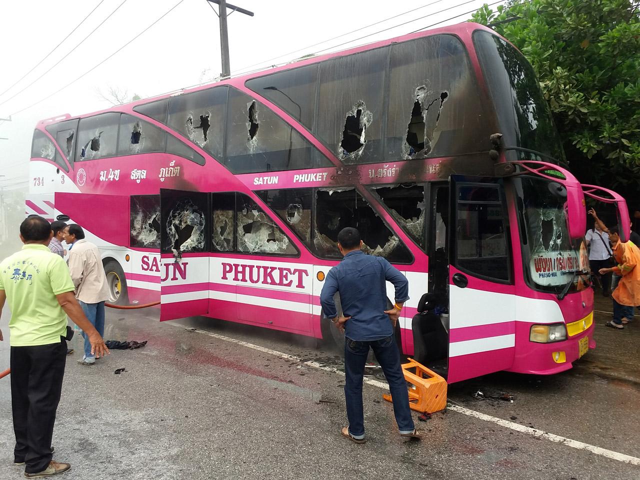ที่เกิดเหตุริมถนนเพชรเกษม สายพังงา – โคกกลอย พบรถโดยสารปรับอากาศประจำทาง 2 ชั้น สาย ภูเก็ต-สตูล เลขข้างรถ 734-3 ม.4 ข สีชมพู ทะเบียน ป้ายเหลือง 10-1558 ตรัง ที่บริเวณห้องคนขับมีร่องรอยไฟไหม้ ภายในห้องโดยสาร มีควันไฟเต็มทั่วคัน เจ้าหน้าที่ได้เร่งช่วยเหลือผู้โดยสารที่ติดอยู่ภายใน ซึ่งอยู่ในสภาพสำลักควัน ไม่สามารถออกมาได้ เนื่องจากประตูปิดล็อกอัตโนมัติ ซึ่งเจ้าหน้าที่ได้พังกระจกหน้าต่างด้านข้างท้ายของรถ เพื่อเข้าช่วยเหลือ ผู้โดยสารทั้ง 21 คนพร้อมนำส่ง รพ.พังงา แต่เสียชีวิตระหว่างนำส่งโรงพยาบาล 1 ราย ทราบชื่อ นางแดง พาหรัตน์ อายุ 76 ปี ชาว จ.สตูล นอกจากนี้ ยังพบว่ามีผู้ได้รับบาดเจ็บ อาการสาหัส อีก 3 คน ถูกนำตัวเข้าห้องไอซียู เพื่อรักษาเร่งด่วน