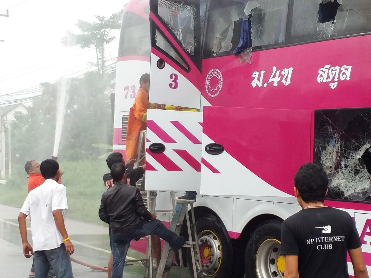 เมื่อเวลา 10.00 น. วันที่ 7 ต.ค.58 ร.ต.ท.ศะศักดิ์ จันทร์ดี พงส.ร้อยเวร สภ.ตะกั่วทุ่ง ได้รับแจ้งว่า มีเหตุไหม้รถโดยสารปรับอากาศประจำทาง 2 ชั้น สายภูเก็ต-สตูล ที่บริเวณ หน้าร้านทรงพลสตีล สามแยกกระโสมหมู่ 1 ต.กระโสม อ.ตะกั่วทุ่ง จ.พังงา จึงพร้อมด้วย เจ้าหน้าที่ ปภ.พังงา แพทย์ พยาบาล รพ.พังงา หน่วยกู้ภัยวัดเก่าเจริญธรรมหน่วยกู้ภัยพังงา หน่วยกู้ชีพภูงา รุดไปตรวจสอบ