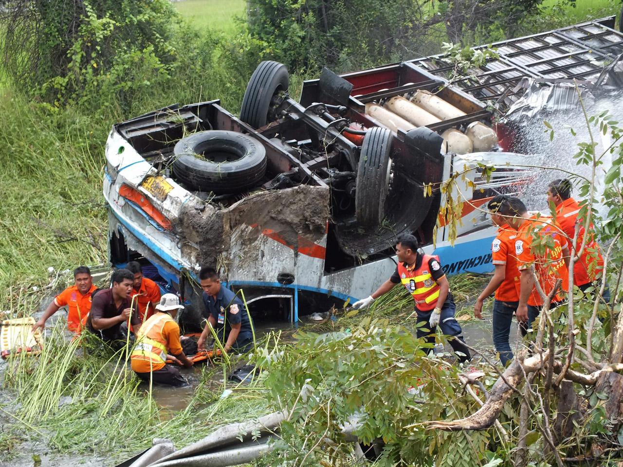 ระทึก! รถทัวร์โดยสารปรับอากาศชั้น 2 สายนครราชสีมา-อุดรธานี เสียหลักพลิกหงายท้อง ตกลงข้างทางบริเวณ ถ.มิตรภาพ อ.คง นครราชสีมา ตาย 3 ศพ บาดเจ็บ 22 ราย มีแก๊สรั่วไหล จนท.เร่งใช้อุปกรณ์ตัดถ่างช่วยเหลือออกมาจากรถ นำส่ง รพ.
