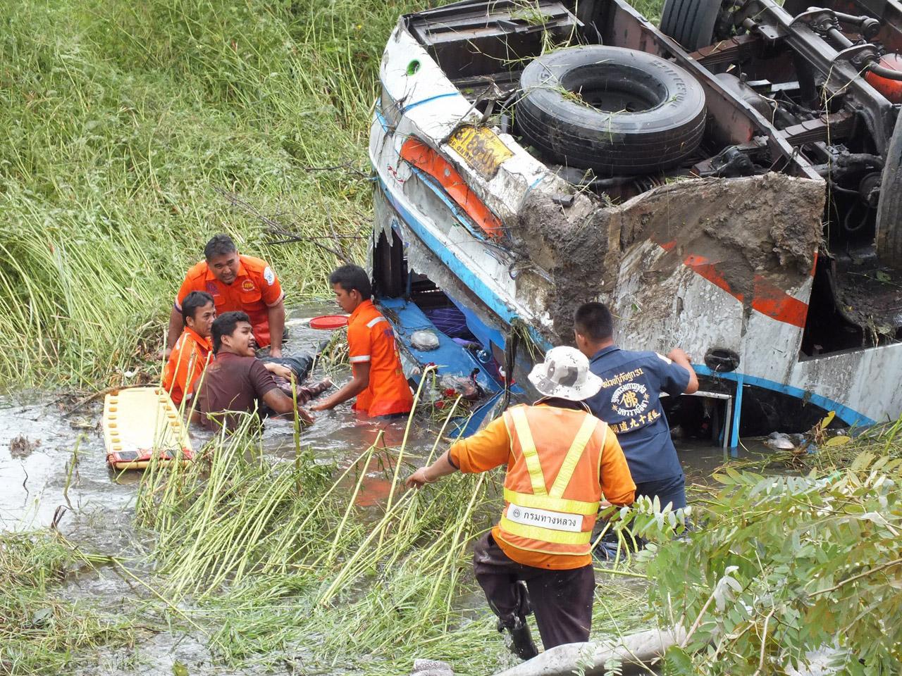 พร้อมใช้อุปกรณ์ตัดถ่างงัดนำร่างผู้เสียชีวิต รวม 3 ราย ที่ติดอยู่ในรถออกมา รวมทั้งต้องคอยฉีดน้ำหล่อเลี้ยงตลอดเวลา เพราะเกรงจะเกิดระเบิดขึ้นจากแก๊สที่รั่วไหลออกมาจากถังเชื้อเพลิงของรถทัวร์อย่างต่อเนื่อง