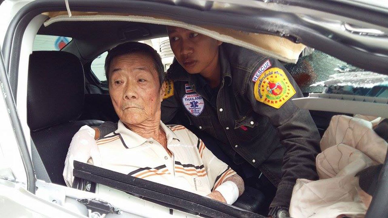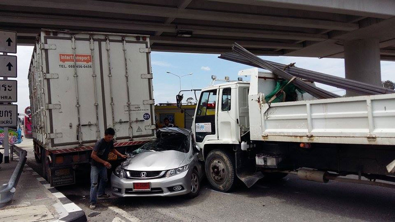 ลุงที่ปราจีนฯออกรถเก๋งป้ายแดงมาหมาดๆ ขับพาลูกๆหลานๆไปเที่ยวสวนสัตว์ เลี้ยวออกคู่ขนานมอเตอร์เวย์ศรีราชา ถูกหกล้อชนท้ายไปอัดกับรถสิบล้อตู้คอนเทนเนอร์โดนขนาบทั้งสองข้าง ตัวเองบาดเจ็บแต่ออกไม่ได้ กู้้ภัยต้องงัดช่วยออกมา...