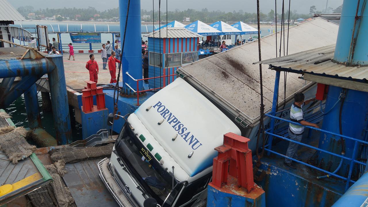 สะพานเหล็กเชื่อมฝั่งเกาะสมุยกับเรือเฟอร์รี่หัก สิบล้อบรรทุกอาหารทะเลสด หนัก 24 ตัน มูลค่ากว่าล้าน หน้าทิ่มชนตัวเรือ หวิดร่วงทะเล โชคดีไม่มีผู้บาดเจ็บ บริษัทเร่งกู้ พร้อมเผย ไม่กระทบผู้โดยสารข้ามฟาก เพราะมีอีกท่ารองรับ