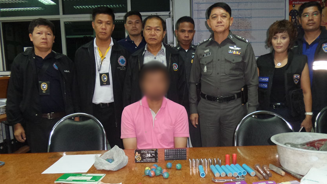 เมื่อเวลา 09.00 น. วันที่ 9 ต.ค. 58 พ.อ.จักราวุธ สินพูนผล รองผู้อำนวยการรักษาความมั่นคงภายในจังหวัดสมุทรสาคร พ.ต.อ.กิตติภณ แก้วอัมพร ผกก.3 กองบังคับการตำรวจสันติบาล 2 พ.ต.อ.ชัยยุทธ ถมยา ผกก.สภ.เมืองสมุทรสาคร พ.ต.ท.หญิง เพ็ญสิรี พันธะจินาธัช รอง ผกก.ตม.จ.สมุทรสาคร พร้อมกำลังเจ้าหน้าที่ตำรวจ นำหมายค้นศาลจังหวัดสมุทรสาคร เข้าตรวจค้นห้องพักเลขที่ 109 ภายในหอพักแห่งหนึ่ง ต.นาดี อ.เมืองสมุทรสาคร พบ นายโหน่งปะหนี่ อายุ 28 ปี สัญชาติพม่า ตรวจสอบห้องพักพบเครื่องกระสุนปืนขนาด .38 จำนวน 21 นัด กระสุนปืนลูกซอง 2 นัด ประทัดยักษ์ 11 ลูก ดินดำน้ำหนัก 0.5 กิโลกรัม อุปกรณ์ทำประทัด หนังสือเดินทางจำนวน 11 เล่ม เงินสด 20,000 บาท พร้อมบัญชีกู้ยืมเงินอีกจำนวนหนึ่ง