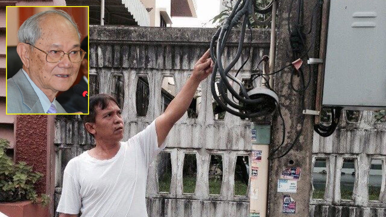 ชาวบ้านชี้สภาพสายเมนมิเตอร์ไฟฟ้า ซึ่งเจ้าหน้าที่ กฟภ.ต่อเรียบร้อย หลัง 3 คนร้ายขับรถเก๋งวอลโว่เก่า ลอบตัดขาดก่อนขึ้นรถหลบหนีไป เหตุเกิดที่บ้านของนายมีชัย ฤชุพันธุ์ (รูปเล็ก) สมาชิก คสช.และประธาน กรธ. ที่หมู่บ้าน เมืองทองธานี จ.นนทบุรี.