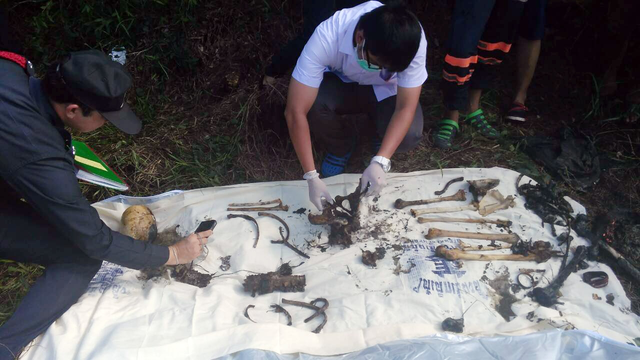 ที่เกิดเหตุ พบศพชายไม่ทราบชื่อ หมกอยู่ในพงหญ้าป่าชายเลน สภาพศพเหลือแต่โครงกระดูก ในสภาพนอนคว่ำหน้า โดยผู้ตายสวมเสื้อยืดแขนสั้นสีดำ สวมเสื้อยีนส์แขนยาวสีดำทับ สวมกางเกงยีนส์สามส่วนสีน้ำเงิน นุ่งกางเกงในสีขาวมีลายดอกไม้ จากการตรวจสอบเบื้องต้น พบว่ากะโหลกศีรษะบริเวณกลางกระหม่อม และท้ายทอยมีรอยแตกร้าว ส่วนชิ้นส่วนกระดูกส่วนอื่นๆ ยังไม่สามารถตรวจสอบร่องรอยใดๆ ได้