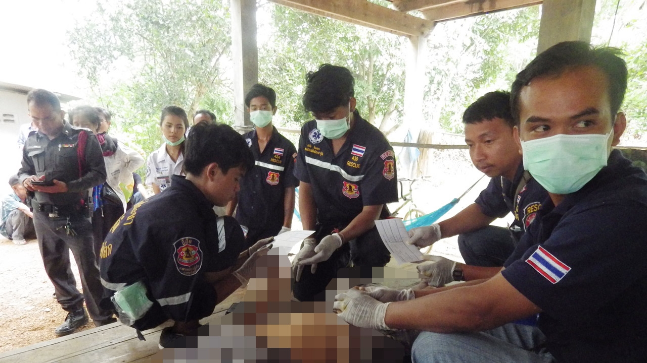 ที่เกิดเหตุเป็นบ้านไม้ชั้นเดียวยกพื้นสูง 2 เมตร พบศพ นายพยอม ทรัพย์สิน อายุ 48 ปี เจ้าของบ้าน ใช้ผ้าขาวม้าสีน้ำเงินมัดกับขื่อใต้ถุนบ้าน จากนั้นได้ห้อยตัวลงมาคอหักเสียชีวิต จนท.จึงได้ช่วยกันนำศพลงมานอนที่เตียง จากการตรวจสอบไม่พบร่องรอยการถูกทำร้ายร่างกายแต่อย่างใด เสียชีวิตมาแล้วไม่ต่ำกว่า 5 ชั่วโมง