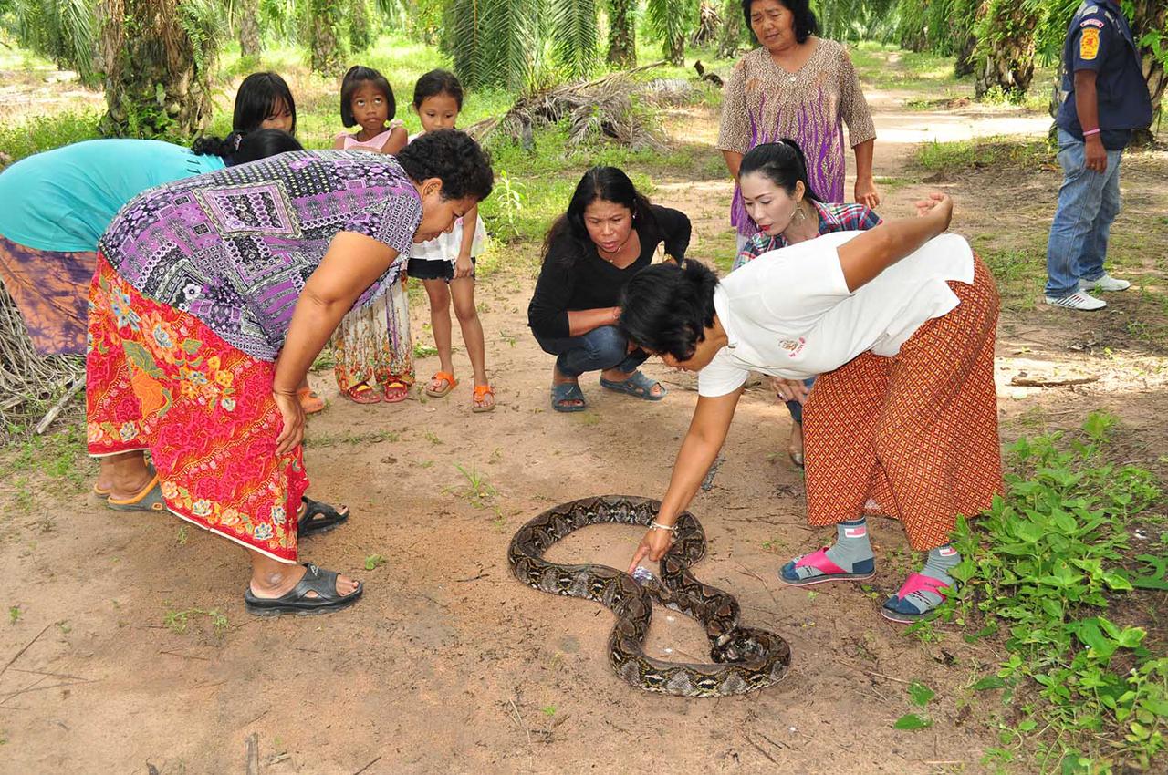 ที่จ.ชุมพร น.ส.ราตรี จันทรรัตน์ ประมงอำเภอละแม นำเจ้าหน้าที่ไปช่วยเหลืองูเหลือมขนาดยาว3เมตร เพศเมีย ที่ถูกรถจักรยานยนต์ของชาวบ้านทับที่หัวได้รับบาดเจ็บ นอนขดตัวเป็นเลข 8 อยู่ในสวนปาล์ม หมู่11 ต.ละแมนานหลายวัน ขาวบ้านเชื่อว่าเป็นงูเจ้าที่ เพราะเห็นมานานหลายปี ไม่มีใครกล้าทำร้าย และหลังเกิดเหตุคนที่ขี่รถทับต้องนำธูปมาไหว้ขอขมา หลังจากฝันเห็นผู้หญิงร้องไห้ถึง 3 คืนติดกัน.