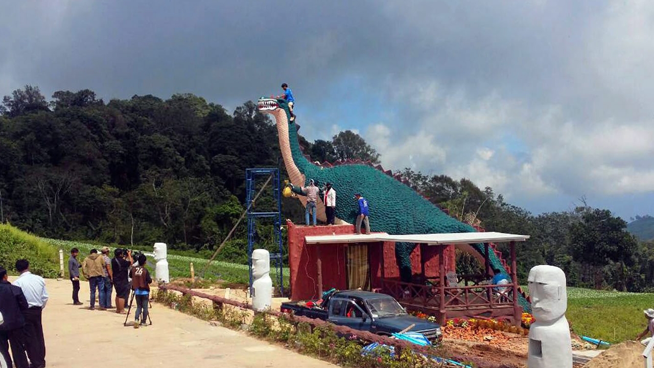 คนงานก่อสร้างเข้ารื้อถอนรูปปั้นไดโนเสาร์ภายใน “ทับเบิกฮิลล์รีสอร์ต” ที่ก่อสร้างอยู่บนภูทับเบิก ต.วังบาล อ.หล่มเก่า จ.เพชรบูรณ์ หลังทางจังหวัดท้วงติงถึงความไม่เหมาะสมกับสภาพพื้นที่ซึ่งส่วนใหญ่ปลูกกะหล่ำปลี.