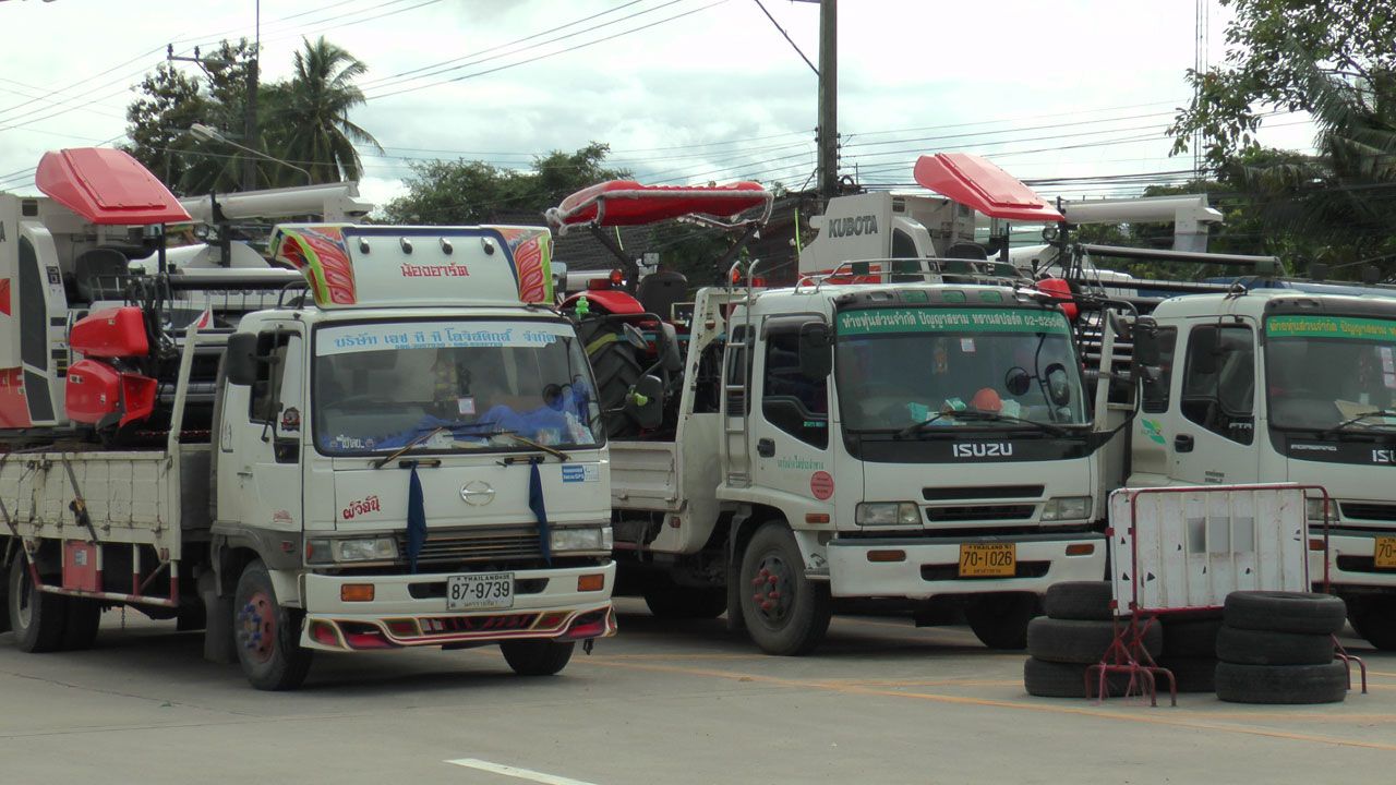 ด่านถาวรสะพานมิตรภาพไทย-เมียนมา แออัดแต่เช้า พบรถไถ รถแทรกเตอร์ รถเกี่ยวข้าว ส่งออกจำนวนมาก หลังแรงงานแห่ทำงานในไทย เพราะได้ค่าแรงสูงกว่า ทำเมียนมาขาดแรงงานเกษตร ต้องสั่งเครื่องจักรทดแทน