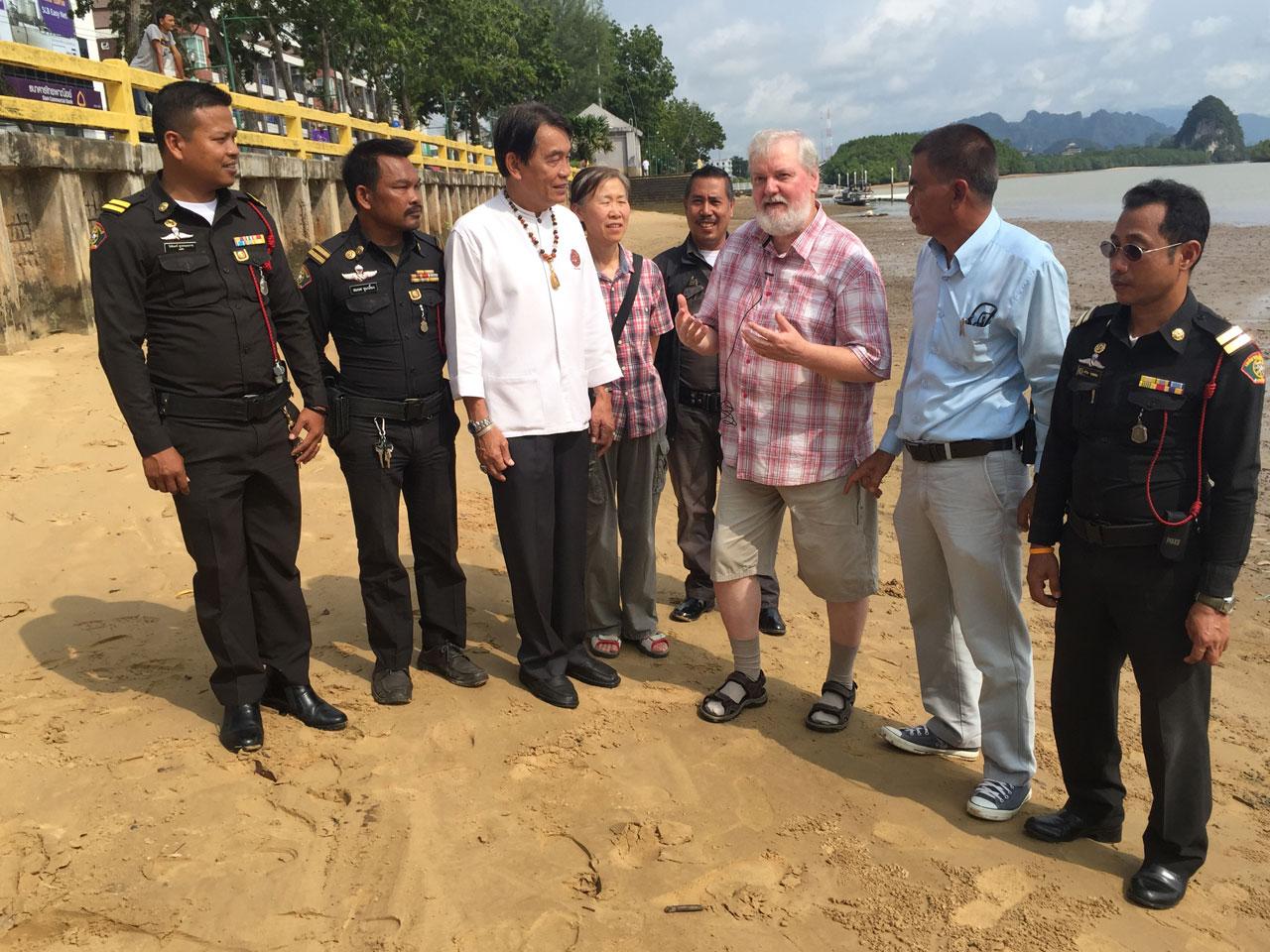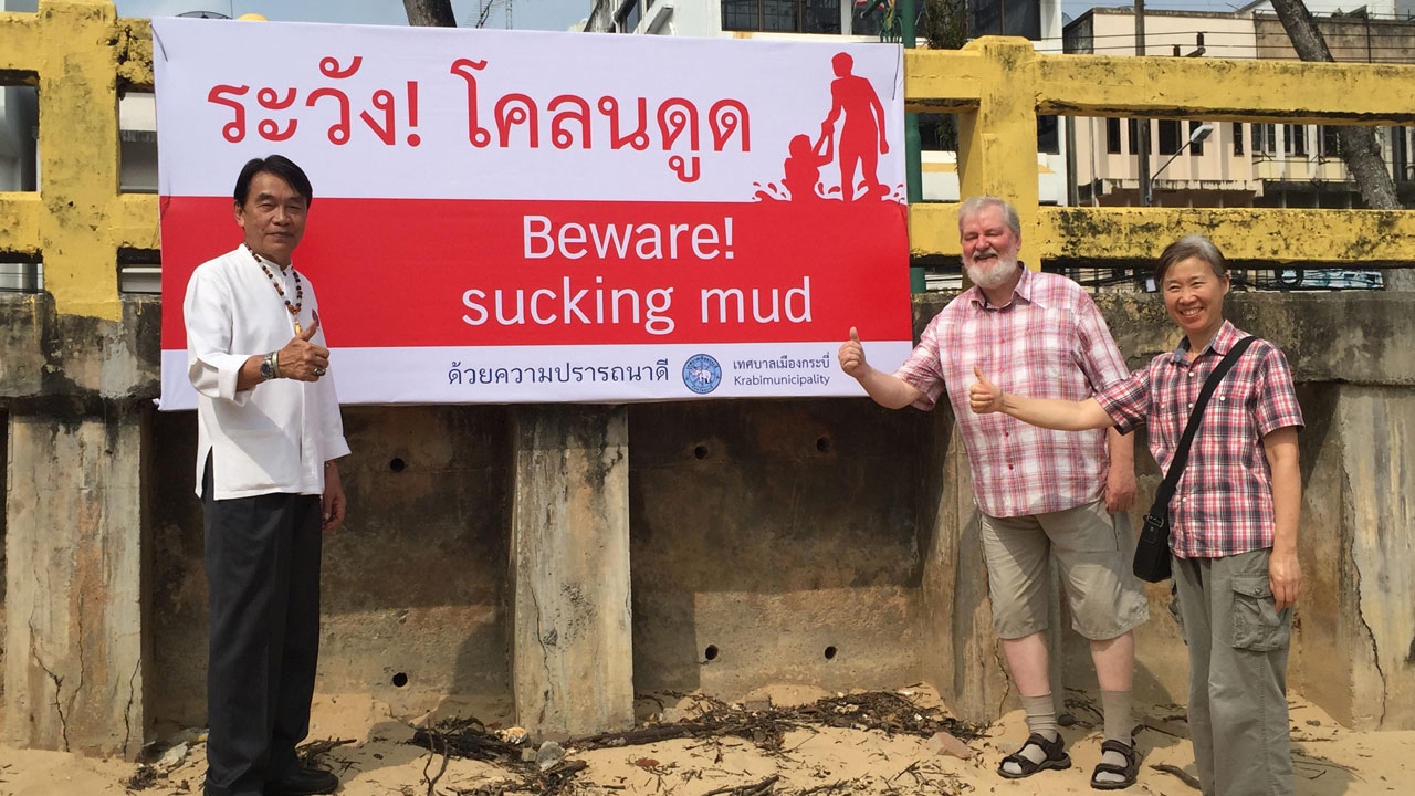 ผู้ว่าฯ กระบี่ นำฝรั่งเหยื่อโคลนดูด ติดป้าย "ระวังโคลนดูด" เตือนภัยนักท่องเที่ยวบริเวณแม่น้ำหน้าเมืองกระบี่ 2 จุด ใช้ภาษาไทยและภาษาอังกฤษ พร้อมเผยแพร่บทประพันธ์ของ อ.เนาวรัตน์ พงษ์ไพบูลย์ กวีซีไรต์ เขียนถึงฮีโร่กระบี่