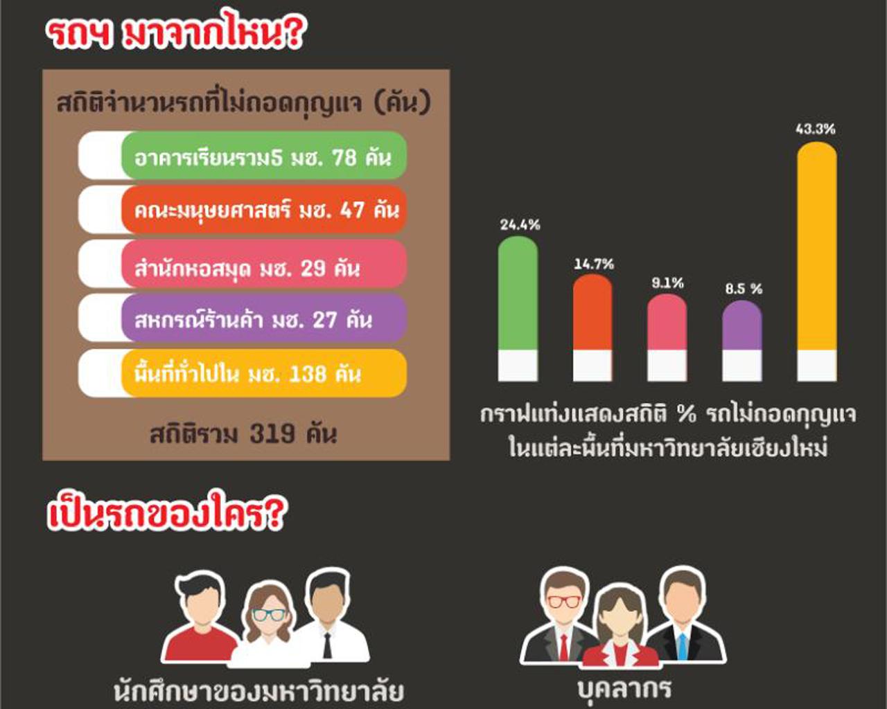 ทั้งนี้ จากการเก็บรวบรวบสถติการลืมกุญแจเสียบคารถไว้ แบ่งเป็นอาจารย์/บุคลากร 8 คัน นักศึกษา 291 คัน และบุคคลภายนอก 20 คัน ซึ่งจากข้อมูลที่ผ่านมาพบว่าการลืมกุญแจคาไว้ที่รถจักรยานยนต์เป็นสาเหตุสำคัญที่ทำให้รถสูญหาย เพราะมักมีมิจฉาชีพแฝงตัวเข้ามาขับรถคันที่ลืมกุญแจทิ้งไว้ออกไป มหาวิทยาลัยจึงได้ส่งทีมเจ้าหน้าที่รักษาความปลอดภัยออกตรวจตราในพื้นที่ เพื่อป้องกันการสูญหายที่อาจเกิดขึ้น หากพบเห็นว่ามีการลืมกุญแจคาไว้ที่รถจักรยานยนต์ จะนำมาเก็บรักษาไว้ที่สำนักงานรักษาความปลอดภัย ดังนั้น ผู้ลืมกุญแจไว้ที่รถ และพบว่ารถไม่อยู่ในที่จอดเดิม สามารถไปรับคืนได้ที่สำนักงานรักษาความปลอดภัยของมหาวิทยาลัยเชียงใหม่ โดยจะมีการลงบันทึก รายงานการดำเนินงาน และรวบรวมจัดทำข้อมูลไว้เป็นหลักฐาน