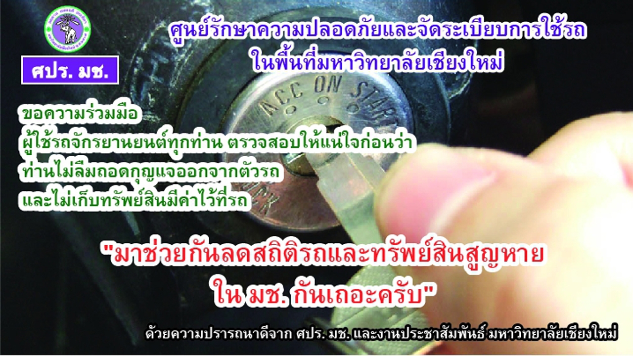 "จากสถิติการลืมกุญแจคารถจักรยานยนต์ไว้มากถึง 319 คันในช่วง 6 เดือนที่ผ่านมา ทางศปร. มหาวิทยาลันยเชียงใหม่ จึงขอความร่วมมือผู้ใช้รถจักรยานยนต์ทุกท่าน ตรวจสอบให้แน่ใจก่อนว่า ก่อนลงจากรถทุกครั้ง ท่านไม่ลืมถอดกุญแจออกจากตัวรถ และไม่เก็บทรัพย์สินมีค่าไว้ที่รถ เพื่อป้องกันรถและทรัพย์สินสูญหาย" หัวหน้างานประชาสัมพันธ์ มช.กล่าว.
