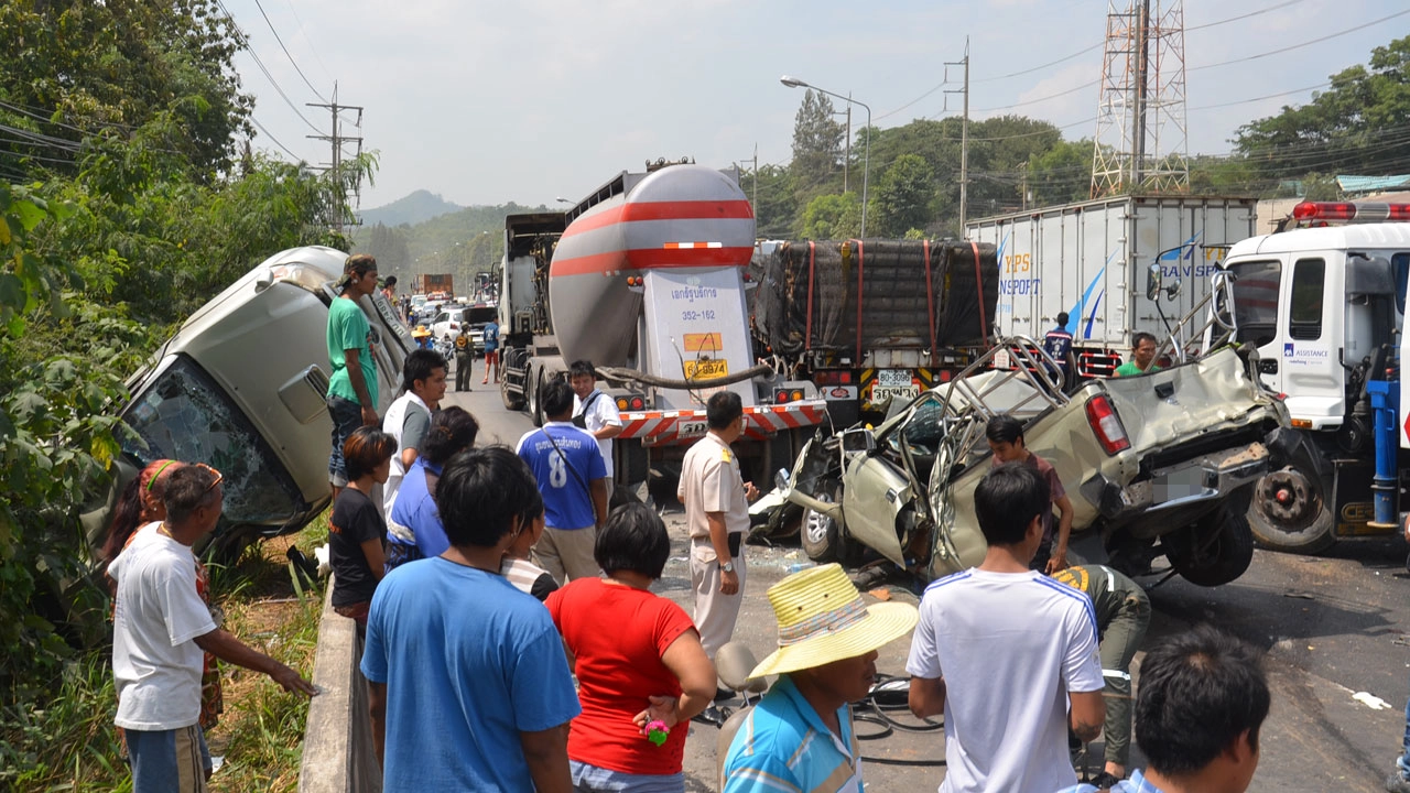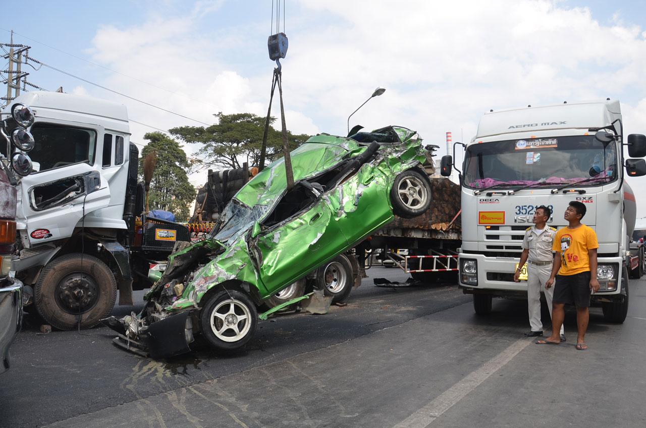 เทรลเลอร์ 22 ล้อ บรรทุกไม้เต็มคันจากบึงกาฬ ถูกกระบะตัดหน้าช่วงลงเนินวัดซับบอน อ.แก่งคอย สระบุรี เบรกไม่อยู่เสียหลักพุ่งชนรถติดด้านหน้า 5 คันรวด ทำบาดเจ็บเล็กน้อย 9 คน