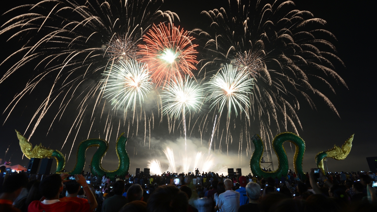 เมื่อเวลา 21.00 น. วันที่ 26 ต.ค. 58 ที่กลางแม่น้ำโขง บริเวณตลิ่งหน้าวัดลำดวน เขตเทศบาลเมืองหนองคาย นายสุชาติ นพวรรณ ผวจ.หนองคาย เป็นประธานเปิดการแสดงพลุเฉลิมพระเกียรติกลางแม่น้ำโขง หนึ่งในกิจกรรมงานเทศกาลออกพรรษาบั้งไฟพญานาค จังหวัดหนองคาย ประจำปีนี้