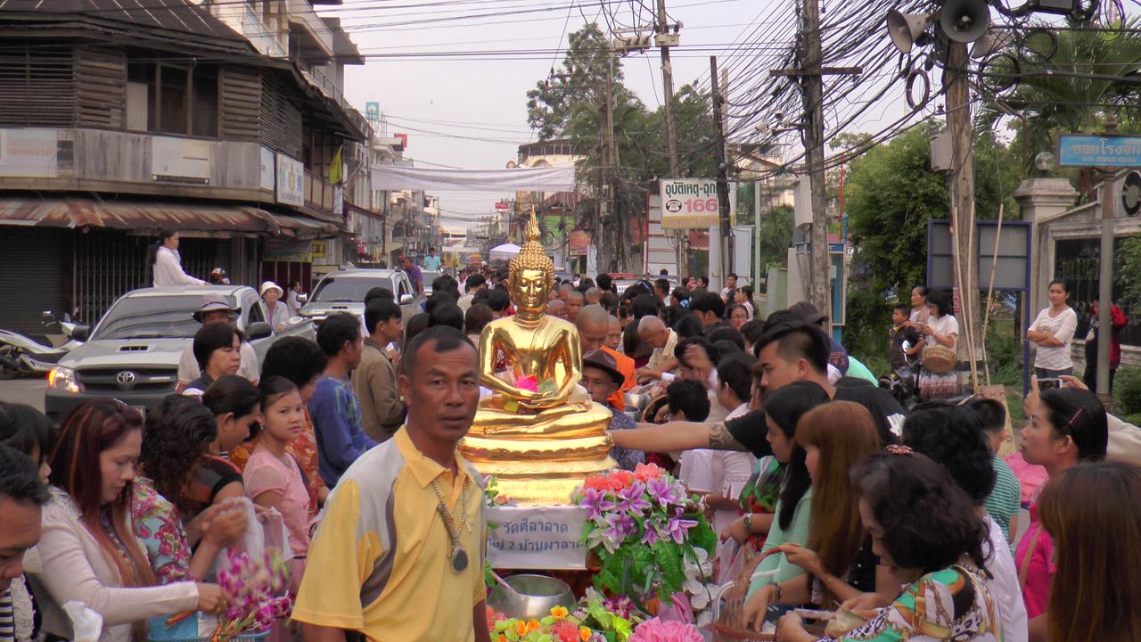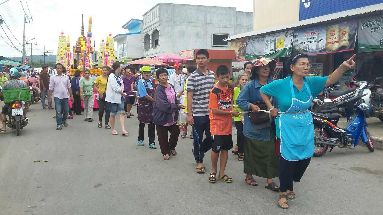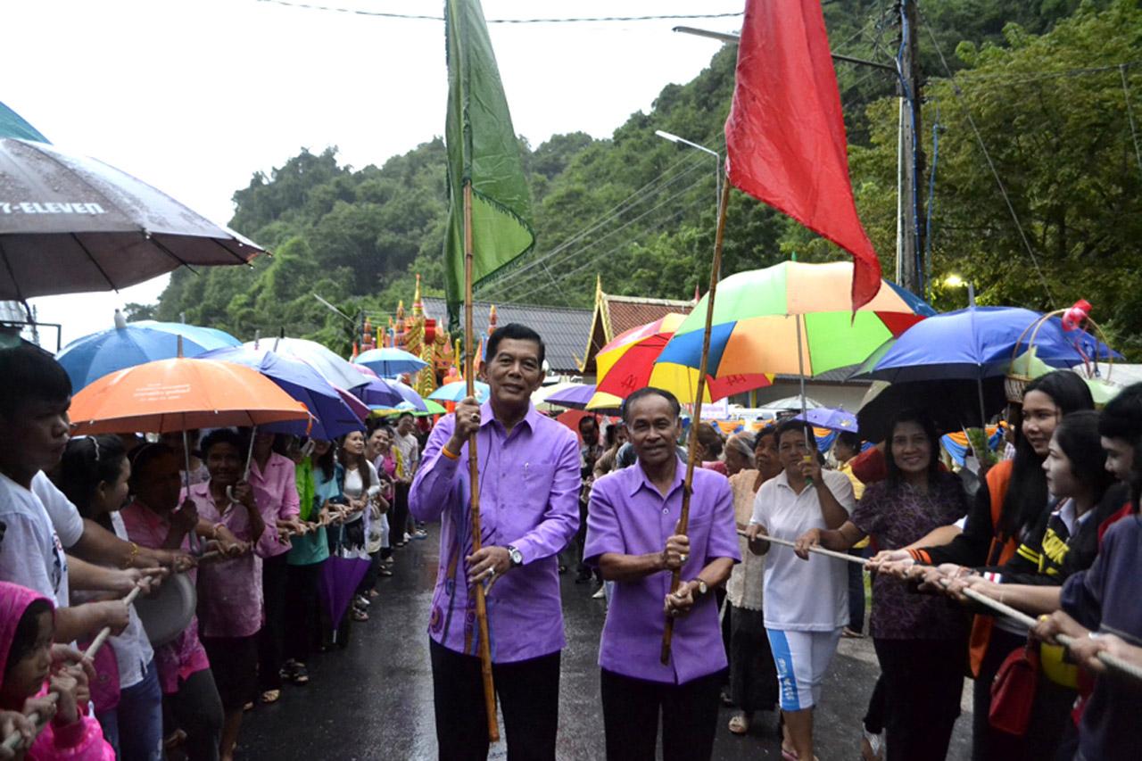 ลานหน้าสำนักวิปัสสนาวังสันติบรรพต (เขาวังเนียง) ต.คูหาสวรรค์ นายวินัย บัวประดิษฐ์ ผู้ว่าราชการจังหวัดพัทลุง พร้อมพุทธศาสนิกชนทำบุญตักบาตรท่ามกลางฝนโปรยปราย และร่วมกันลากเรือพระไปยังชายหาดแสนสุขลำปำ ซึ่งบรรยากาศเป็นไปอย่างคึกคัก.