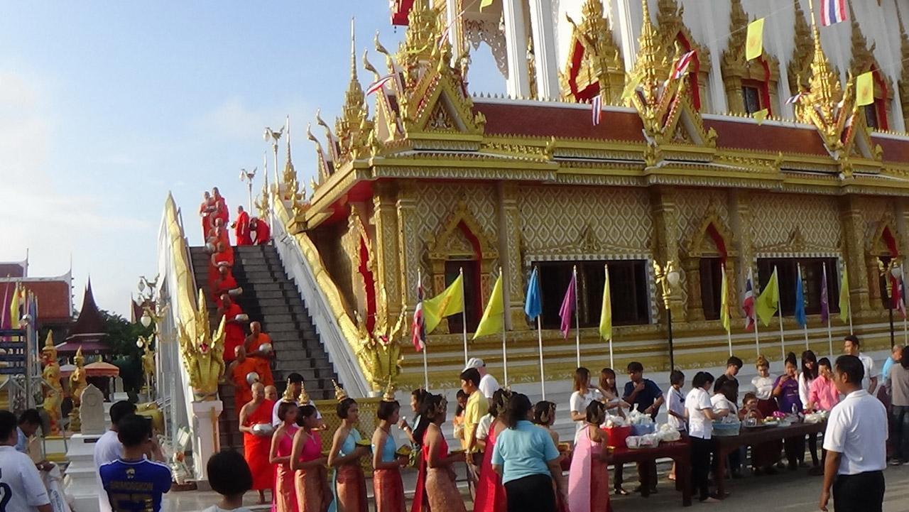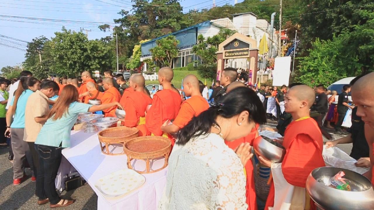 บริเวณลานหน้ามณฑปพระพุทธบาทจำลอง วัดพระมหาธาตุวรมหาวิหาร จ.นครศรีธรรมราช นายพีระศักดิ์ หินเมืองเก่า ผู้ว่าราชการจังหวัดนครศรีธรรมราช เป็นประธานในพิธีตักบาตร มี พระเทพวินยาภรณ์ เจ้าอาวาส รองเจ้าคณะภาค 16-17-18 ธรรมยุติ เป็นประธานฝ่ายสงฆ์ กล่าวสัมโมทนียกถา และนำพระสงฆ์ สามเณร 100 รูป บิณฑบาต ซึ่งพุทธศาสนิกชนที่แต่งกายด้วยชุดสีขาวเข้าร่วมจำนวนมาก
