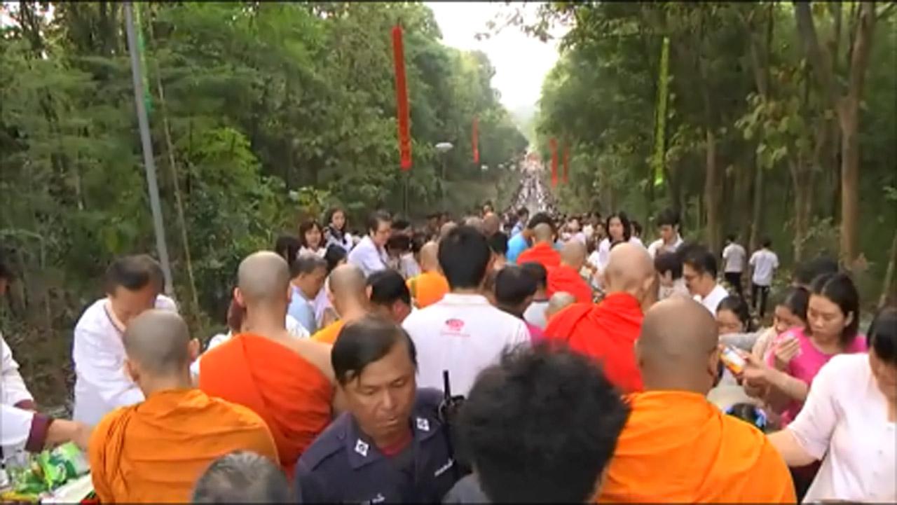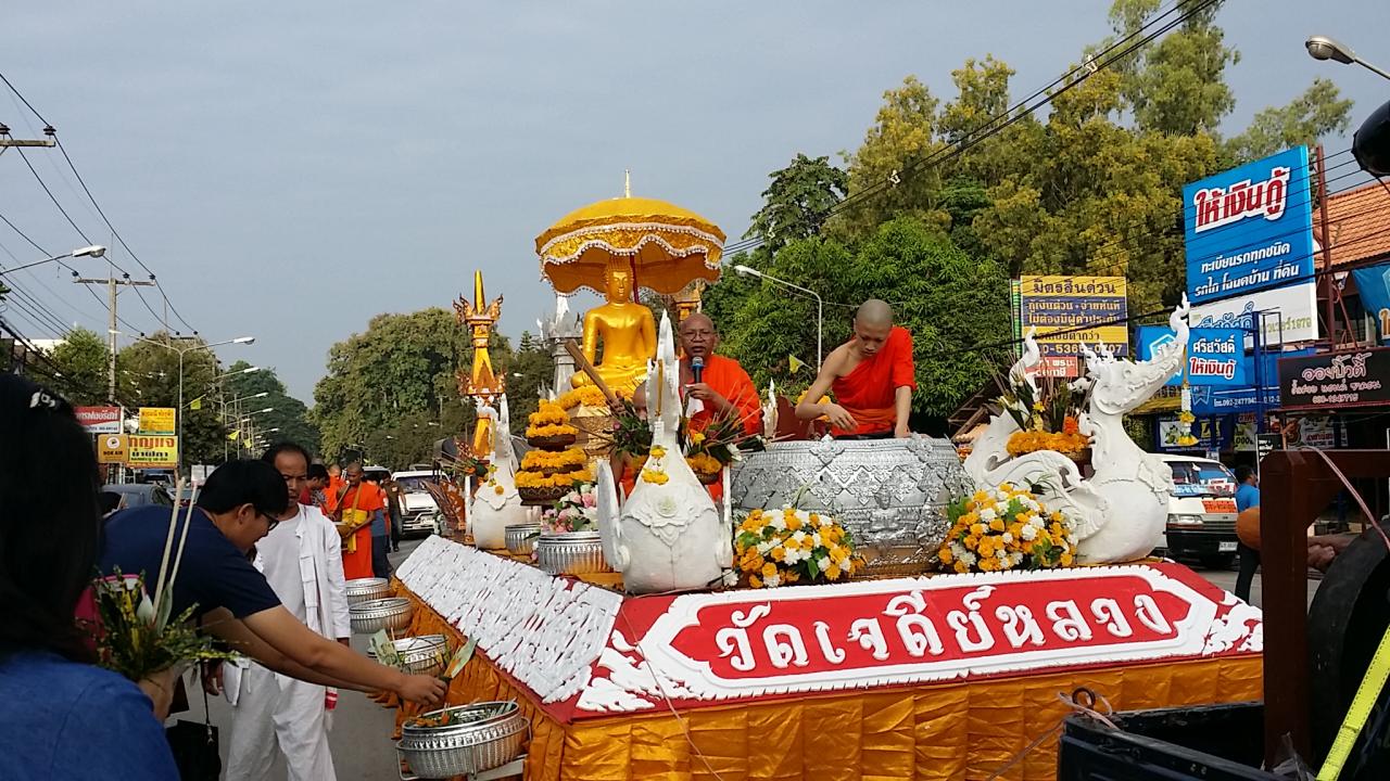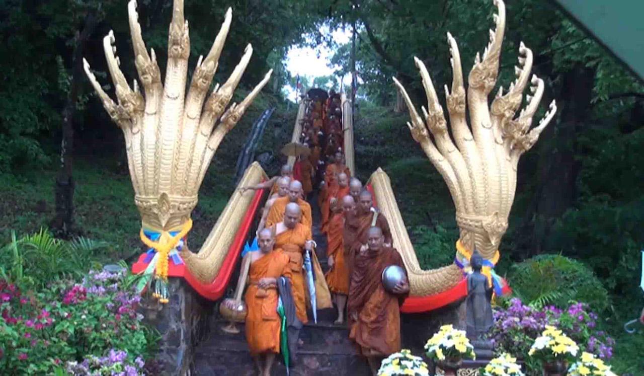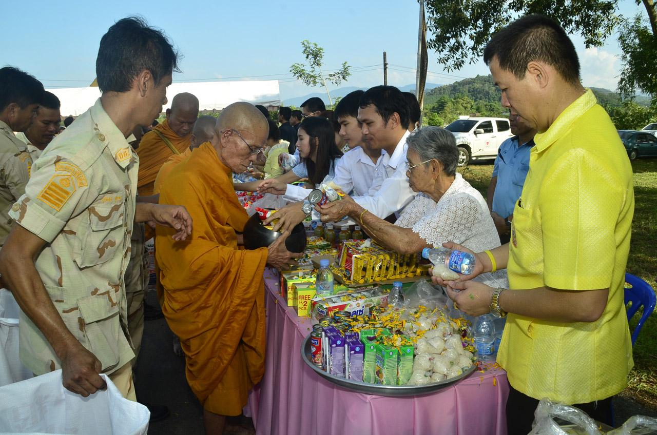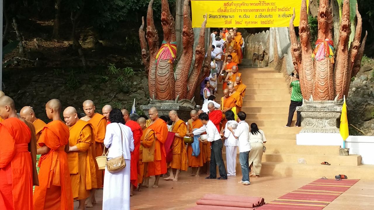 พุทธศาสนิกชนใน จ.พะเยา กว่า 2,000 คน นำโดย นายศุภชัย เอี่ยวสุวรรณ ผู้ว่าราชการจังหวัดพะเยา พร้อมด้วยข้าราชการ ทหาร ตำรวจ และประชาชน ร่วมทำบุญตักบาตรพระสงฆ์ สามเณร 108 รูป ที่บริเวณบันไดนาควัดพระธาตุจอมทอง โดยได้จัดให้มีขบวนกังสดาล เหล่าเทพบุตร และเทพธิดา นำพระสงฆ์เข้ารับบิณฑบาต