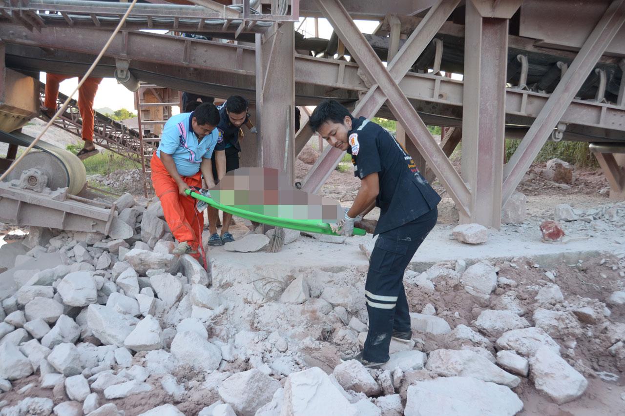 หลังรับแจ้ง ร้อยเวร พร้อมด้วยเจ้าหน้าที่หน่วยกู้ภัยสัจจพุทธรรมกบินทร์บุรี เดินทางไปยังที่เกิดเหตุ และจากการตรวจสอบพบว่า ผู้เสียชีวิตตกอยู่ที่สายพานลำเลียงหิน ทางเจ้าหน้าที่ตำรวจ จึงได้ให้หน่วยกู้ภัยช่วยกันนำร่างออกจากสายพานลงมาด้านล่าง และจากการตรวจสภาพศพ พบว่า บริเวณใบหน้าและลำตัว ถูกเครื่องย่อยบดจนกระดูกแหลกเหลว เนื่องจากถูกเครื่องโม่หินบดร่างพร้อมก้อนหินจากข้างบนลงมาสู่สายพาน จนทำให้เครื่องโม่หินมีเลือดกระจายเต็มไปทั่ว