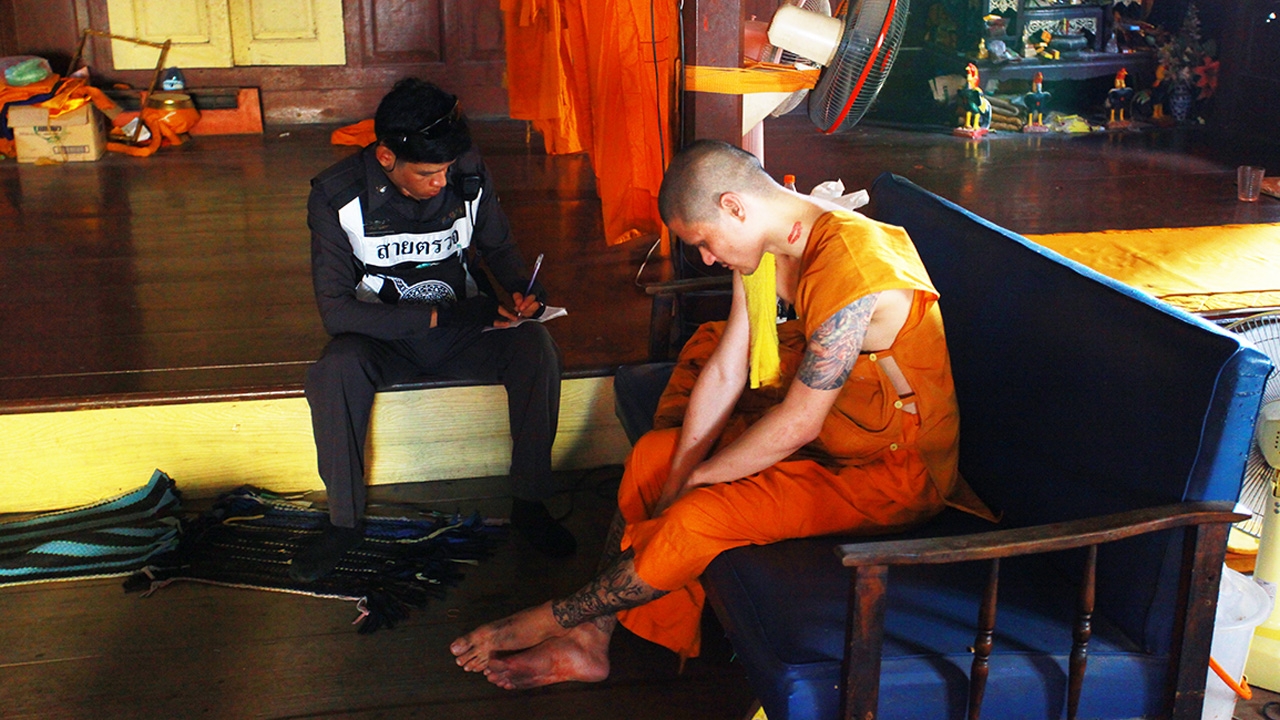 ที่เกิดเหตุพบพระเกรียงไกร ปุณยกุสโร อายุ 29 ปี ยืนอยู่ และข้างๆมีไม้ตะพดยาวประมาณ 1 เมตร วางอยู่ด้วย นอกจากนี้ บริเวณหน้ากุฏิและในกุฏิ พบรอยเลือดหยดอยู่ที่พื้นจำนวนมาก ส่วนคู่กรณีทราบว่าชื่อพระปรีชา ปรีชาโน อายุ 50 ปี ถูกพระเกรียงไกร ตีด้วยไม้ตะพดจนศีรษะแตก สลบเหมือด ถูกหามส่ง รพ. สมุทรปราการไปก่อนหน้านี้ โดยแพทย์ได้ทำการรักษาด้วยการเย็บที่ศีรษะกว่า 50 เข็ม ขณะนี้อาการปลอดภัยแล้ว