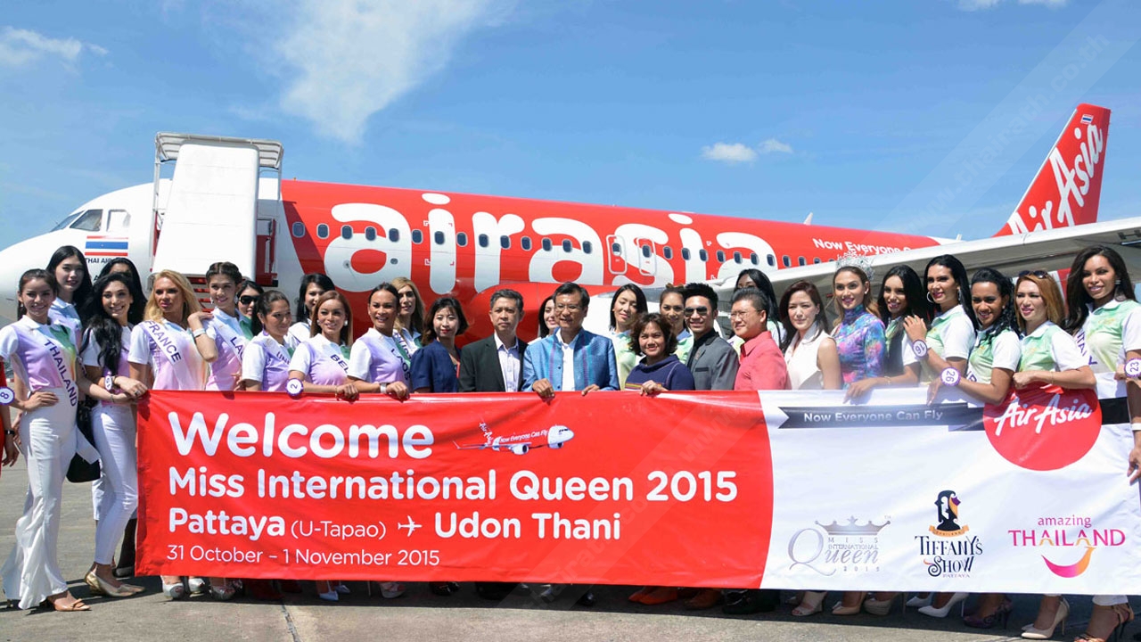 เมื่อเวลา 11.30 น. วันที่ 31 ต.ค. ที่ท่าอากาศยานนานาชาติ จ.อุดรธานี นายชยาวุธ จันทร ผวจ.อุดรธานี, ว่าที่ร.ต.อัธยา มัยลาภ รรท.ผอ.ท่าอากาศยาน จ.อุดรธานี, น.ส.สาวิตรี สังศรีสวัสดิ์ ผจก.แอร์เอเชีย จ.อุดรธานี, นายกฤษ พัฒนสาร ผจก.ฝ่ายธุรกิจสัมพันธ์ไทยแอร์เอเชีย และ นางสมฤดี ชาญชัย ผอ.การท่องเที่ยวแห่งประเทศไทย ภูมิภาคตะวันออกเฉียงเหนือ ให้การต้อนรับ 28 สาวงาม ตัวแทนจาก 19 ประเทศ ผู้เข้าประกวด “Miss International Queen 2015” เดินทางมาเก็บตัวและทำกิจกรรมเพื่อส่งเสริมการท่องเที่ยว จ.อุดรธานี