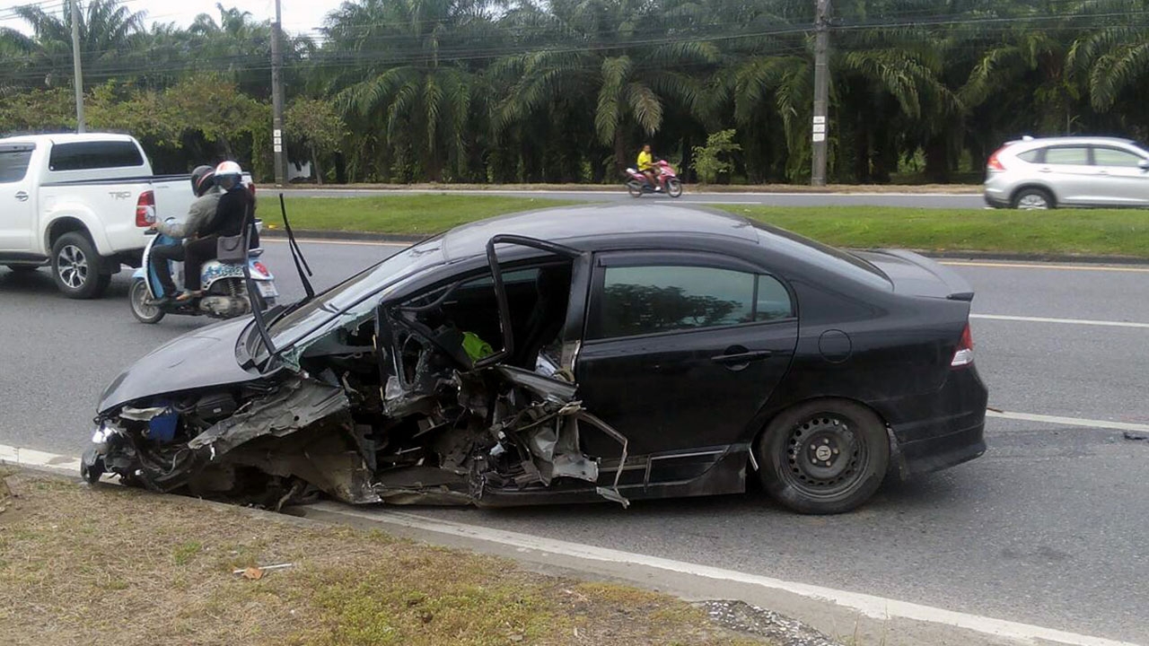 เมื่อเวลา 07.00 น. วันที่ 2 พ.ย. ขณะที่ พ.ต.ท.ศรายุทธ มีบุญ สวป.สภ.ถลาง จ.ภูเก็ต กำลังควบคุมดูแลการจราจรในพื้นที่รับผิดชอบ ได้รับแจ้งว่าเกิดอุบัติเหตุรถเก๋งพุ่งชนเสาไฟฟ้าข้างทาง ห่างจากโค้งศาลเจ้าท่าเรือราว 100 เมตร ถ.เทพกระษัตรีขาเข้าเมือง ต.ศรีสุนทร อ.ถลาง ส่งผลให้การจราจรติดขัด จึงพร้อมด้วยหน่วยกู้ภัยมูลนิธิกุศลธรรมภูเก็ตรุดไปตรวจสอบ ที่เกิดเหตุพบรถเก๋งฮอนด้าซีวิค สีดำ ทะเบียน กง 3967 ยะลา จอดอยู่ริมถนนใกล้เสาไฟฟ้า สภาพด้านหน้าซ้ายพังยับ ล้อหน้าซ้ายแตก ประตูซ้ายพังกลายเป็นเศษเหล็กติดอยู่กับตัวถังรถ โดยมีเศษชิ้นส่วนต่างๆ ของรถกระเด็นกระจัดกระจายเกลื่อนพื้นถนน มี น.ส.มาเรียม บินหรีม อายุ 25 ปี อยู่บ้านเลขที่ 138/27 ถ.นาใน ต.ป่าตอง อ.กะทู้ จ.ภูเก็ต นั่งรอเจ้าหน้าที่ตำรวจและบริษัทประกันภัย ซึ่งไม่ได้รับบาดเจ็บแต่อย่างใด