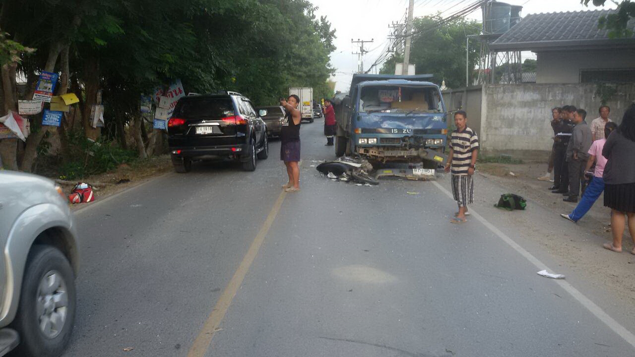 ตรวจสอบที่เกิดเหตุพบรถบรรทุก 6 ล้อดัมพ์ ยี่ห้ออีซูซู สีฟ้า ทะเบียน 81-1851 เชียงใหม่ ได้รับความเสียหาย โดยมีรถจักรยานยนต์ยี่ห้อยามาฮ่า สีขาว ดำ ทะเบียน จคค 657 เชียงใหม่ อยู่หน้ารถบรรทุกสภาพพังเยิบยับ มี นายดนัย ชัวชุมแสง อายุ 38 ปี ที่อยู่ 43 หมู่.10 ต.ป่าผ่า อ.สันทราย จ.เชียงใหม่ แสดงตนเป็นผู้ขับขี่