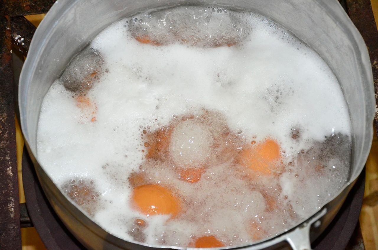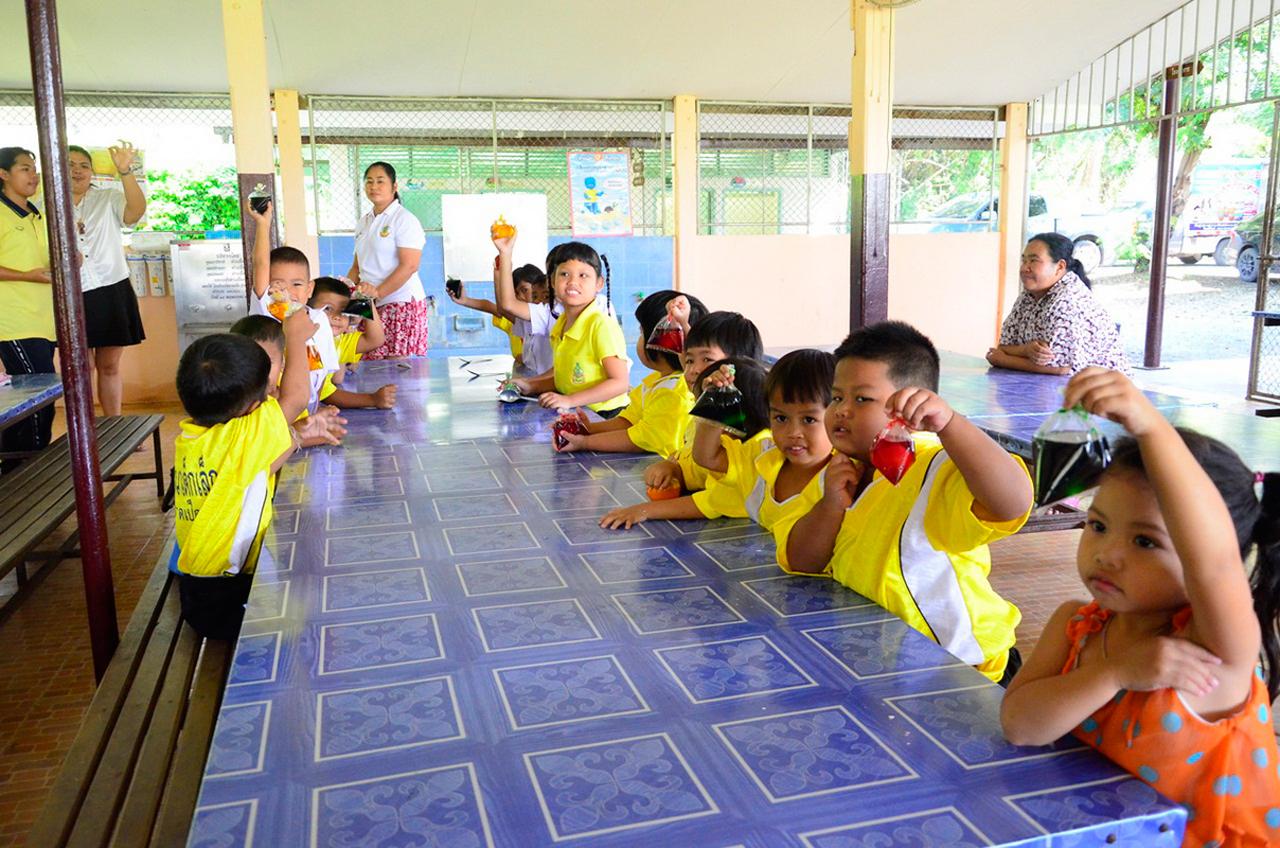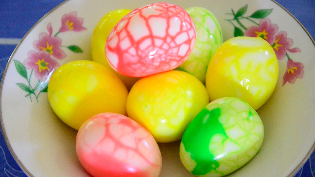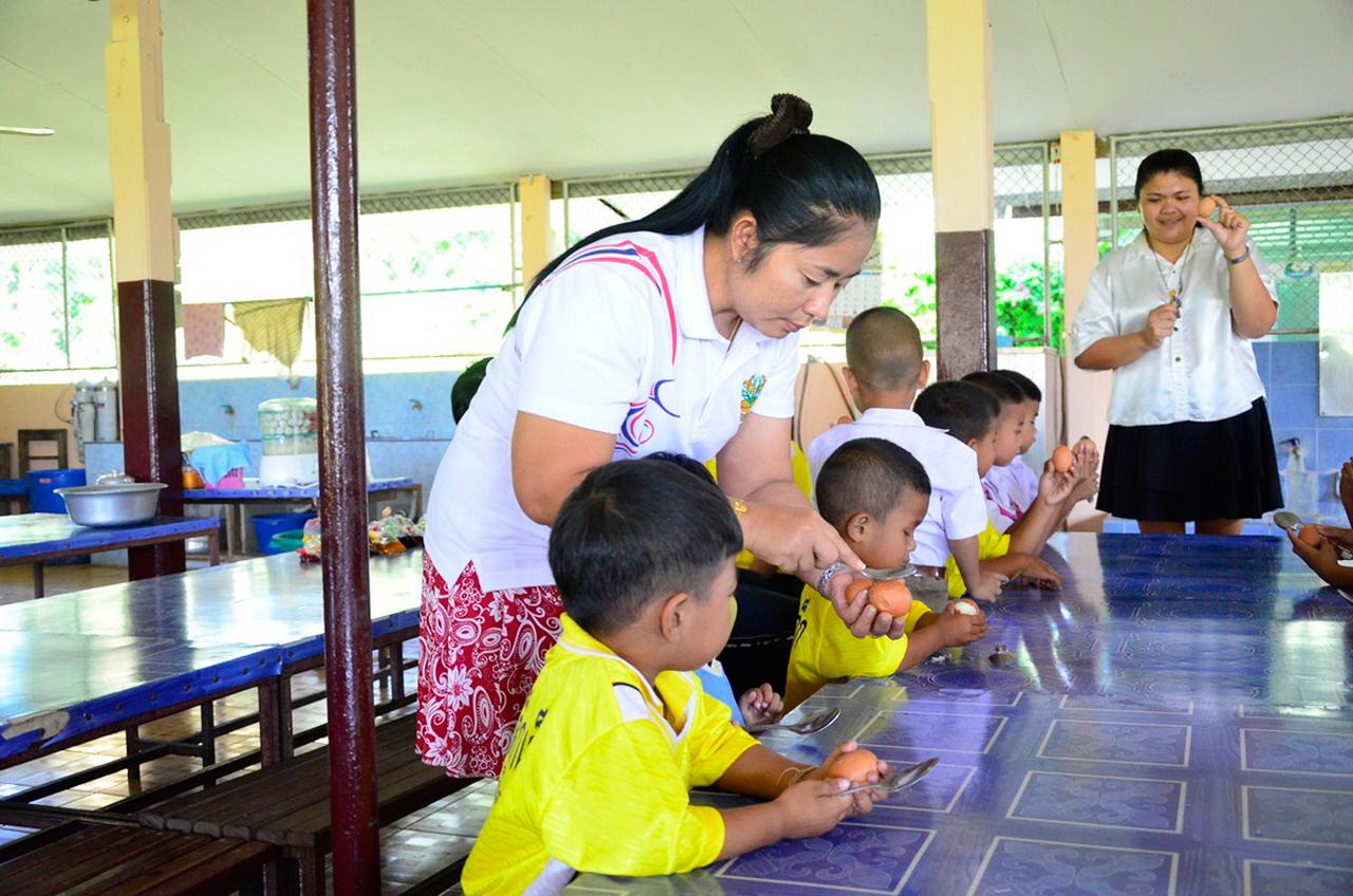 เมื่อไข่ที่ต้มไว้สุกแล้ว ให้นำมาแช่ใส่น้ำเปล่าจนเย็น ในระหว่างที่รอไข่เย็น เราจะนำช้อนยาวมาแจกให้เด็กๆ คนละ 1 คัน เพื่อให้เด็กๆ ได้มีส่วนร่วมในการทำ เมื่อไข่ต้มเย็นแล้วจะนำมาแจกเด็กคนละ 1 ฟอง และจะให้เอาช้อนที่แจกนำมาทุบไข่เบาๆ โดยให้ทุบไปรอบๆ ที่เปลือกไข่ พอมีรอยร้าวที่เปลือก เสร็จแล้ว ก็นำไข่ที่ต้มสุกไปใส่ในถุงที่ผสมสีเตรียมไว้ ใส่ไข่แช่ไว้นาน 5-10 นาที สีที่อยู่ในถุงน้ำจะแทรกซึมตามรอยเปลือกไข่ที่ทุบไว้ พร้อมนำออกมาปลอกเปลือก จะได้สีสันและลวดลายต่างๆ สวยงาม พร้อมนำมาเป็นอาหารกลางวันให้เด็กๆ ได้รับประทานกันต่อไป.