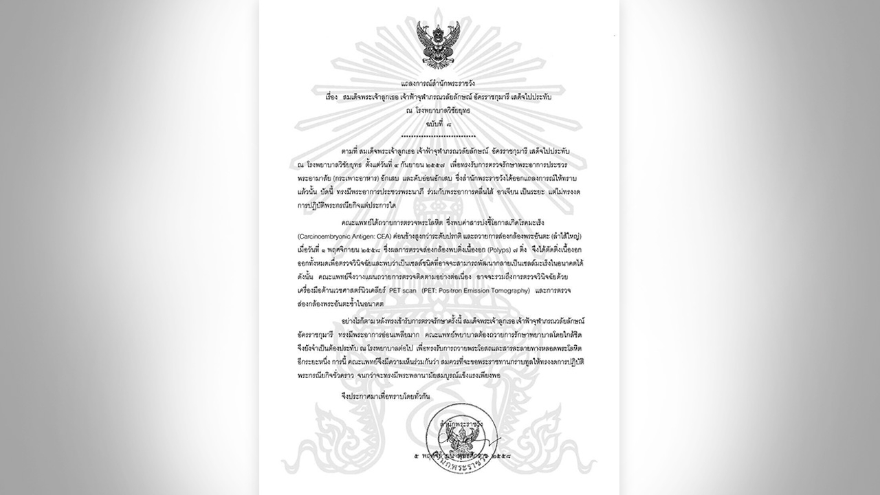 แถลงการณ์สำนักพระราชวัง เรื่อง สมเด็จพระเจ้าลูกเธอ เจ้าฟ้าจุฬาภรณวลัยลักษณ์ อัครราชกุมารี เสด็จไปประทับ ณ โรงพยาบาลวิชัยยุทธ ฉบับที่ 8 คณะแพทย์ถวายการส่องกล้องพระอันตะ พบติ่งเนื้องอก ถวายการรักษาพยาบาลโดยใกล้ชิด
