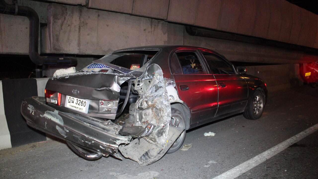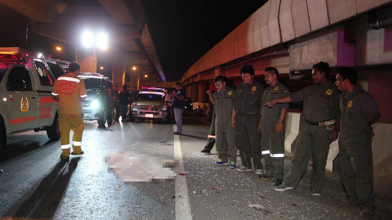 พบศพสาวเซเว่นฯ รถเสียช่องทางด่วน ลงจากรถโบกให้สัญญาญไม่ให้รถตามหลังมาชนท้าย คาดไม่ถึงถูกรถที่ขับตามมาไม่ทราบชนิดพุ่งชน ร่างแหลกเหลว กลางถนนกาญจนาภิเษก ตร.คาด น่าจะเป็นรถบรรทุกก่อเหตุสลด