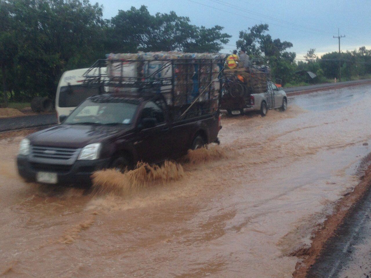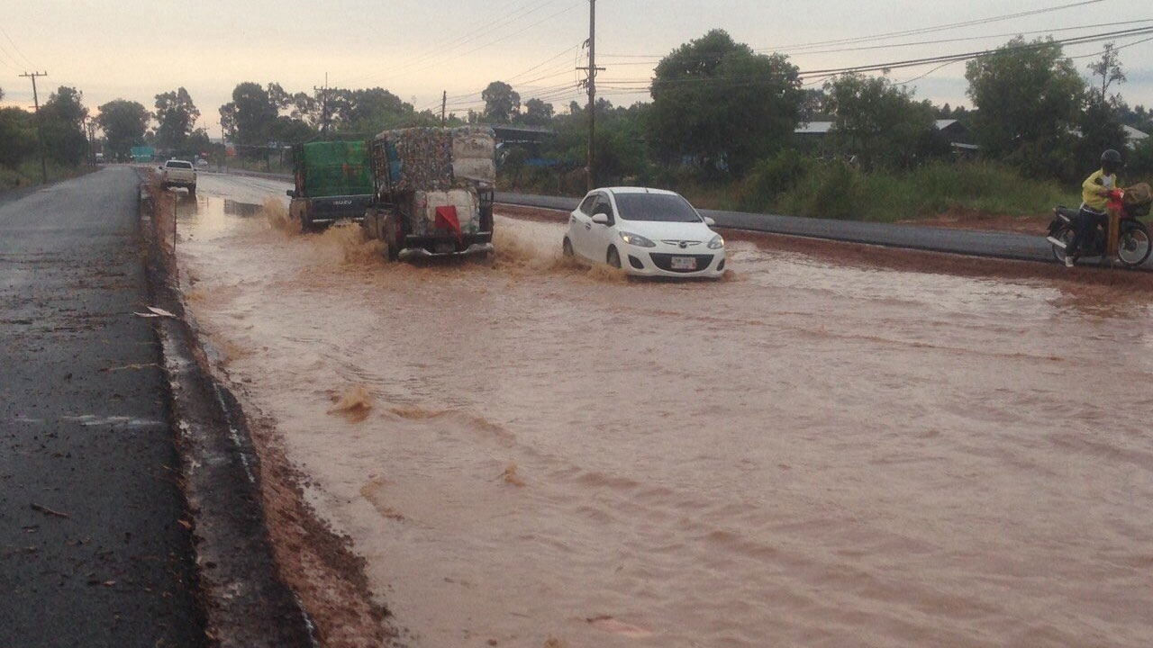 เมื่อเวลา 08.30 น. วันที่ 7 พ.ย.58 ผู้สื่อข่าวรายงานว่า กลุ่มชาวบ้านรวมตัวร้องเรียนโครงการก่อสร้างถนน 4 เลน สายอำนาจเจริญ-อุบลราชธานี ช่วงบ้านศรีสวาท-บ้านสร้างมิ่ง ต.ยางโยภาพ อ.ม่วงสามสิบ จ.อุบลราชธานี ซึ่งผู้รับเหมาได้กำลังทำการก่อสร้างไหล่ทางสูงกว่าพื้นถนนก่อน ทำให้พื้นถนนที่ประชาชนใช้สัญจรไปมาเหลือเพียง 2 เลน และมีฝนตกมาทำให้เกิดน้ำท่วมขังสูง บางจุดกว่า 10 เซนติเมตร ชาวบ้านที่สัญจรไปมาต้องขับรถลุยน้ำ ไม่สามารถหลีกเลี่ยงได้ แม้ทางผู้รับเหมาจะนำรถมาสูบน้ำออกจากถนน แต่ชาวบ้านเกรงว่าหากมีฝนตกลงมาอีกน้ำจะกลับมาท่วมอีกครั้ง สร้างความลำบากในการเดินทาง เพราะถนนเส้นนี้เป็นถนนสายหลักที่ประชาชนชาวจังหวัดอุบลราชธานีและจังหวัดอำนาจเจริญใช้สัญจรไปมาร่วมกัน