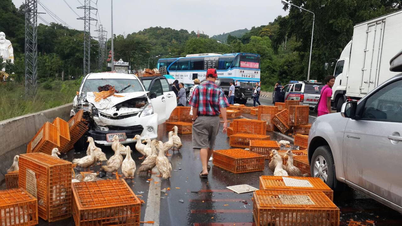 ผู้สื่อข่าวรายงานว่า เนื่องจากมีรถบรรทุกเป็ดประสบเหตุด้วย ทำให้ลังขนเป็ดร่วงหล่นลงมาบนถนน ทำให้มีเป็ดออกมาจากลัง เดินเกลื่อนถนน เจ้าหน้าที่ต้องล้อมจับเป็ดด้วย ซึ่งเหตุดังกล่าว ส่งผลให้การจราจรติดขัดยาวประมาณ 10 กม. เจ้าหน้าที่เข้าพื้นที่ เพื่อให้การช่วยเหลือ พร้อมเร่งระบายรถแล้ว.