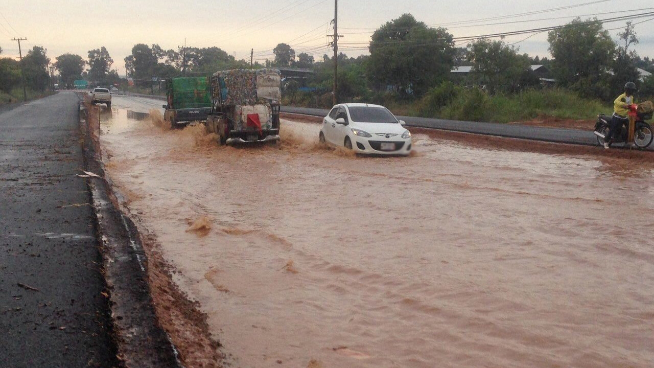 เมื่อเวลา 08.30 น. วันที่ 7 พ.ย. กลุ่มชาวบ้านรวมตัวร้องเรียนโครงการก่อสร้างถนน 4 เลน สายอำนาจเจริญ-อุบลราชธานี ช่วงบ้านศรีสวาท-บ้านสร้างมิ่ง ต.ยางโยภาพ อ.ม่วงสามสิบ จ.อุบลราชธานี ซึ่งผู้รับเหมาได้กำลังก่อสร้างไหล่ทางสูงกว่าพื้นถนนก่อน ทำให้พื้นถนนที่ประชาชนใช้สัญจรไปมาเหลือเพียง 2 เลน และมีฝนตกมาทำให้เกิดน้ำท่วมขังสูง บางจุดกว่า 10 เซนติเมตร ชาวบ้านที่สัญจรไปมาต้องขับรถลุยน้ำไม่สามารถหลีกเลี่ยงได้ แม้ทางผู้รับเหมาจะนำรถมาสูบน้ำออกจากถนนแต่ชาวบ้านเกรงว่าหากมีฝนตกลงมาอีกน้ำจะกลับมาท่วมอีกครั้งสร้างความลำบากในการเดินทางเพราะถนนเส้นนี้เป็นถนนสายหลักที่ประชาชนชาวจังหวัดอุบลราชธานีและจังหวัดอำนาจเจริญใช้สัญจรไปมาร่วมกัน