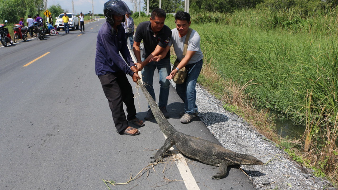 สำหรับสัตว์เลื้อยคลาน ประเภทตัวเงินตัวทอง รวมทั้งงูเหลือมขนาดใหญ่ พบได้บ่อยมากพื้นที่ อ.บางปะกง จ.ฉะเชิงเทรา เนื่องจากเป็นช่วงปากแม่น้ำบางปะกงที่มีควาชุ่มชื้นสูง ส่วนตัวล่าสุดที่พบบนถนน จนถูกรถชนในครั้งนี้ คาดว่าคงขึ้นจากป่ามาหาไออุ่นนอนผึ่งแดด.