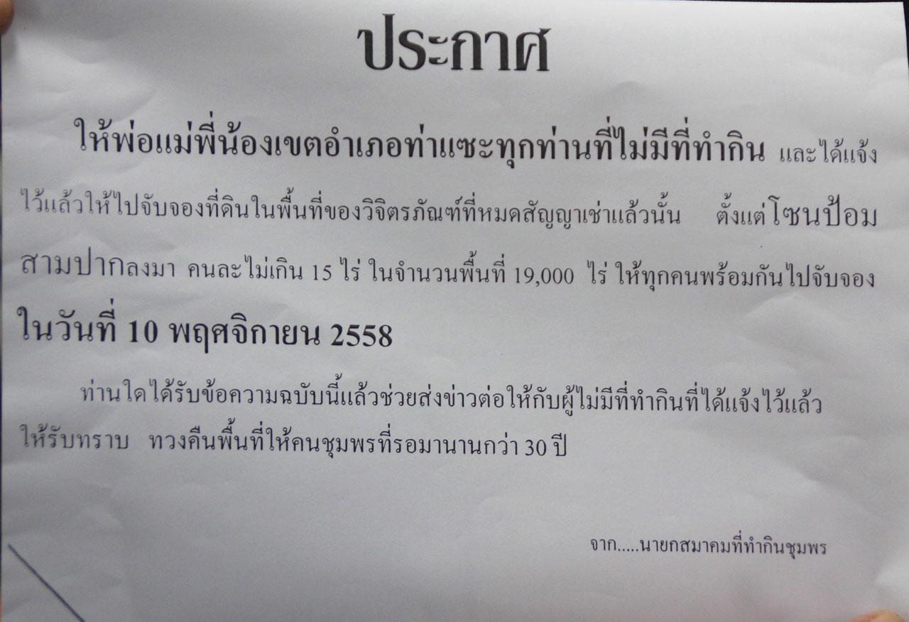 เมื่อวันที่ 9 พ.ย.58 ผู้สื่อข่าวรายงานว่า ที่ จ.ชุมพร ได้มีกลุ่มบุคคลออกแจกจ่ายใบปลิวพิมพ์ด้วยกระดาษ A4 โดยใบปลิวดังกล่าวมีข้อความว่า "ประกาศให้พ่อแม่พี่น้องเขตอำเภอท่าแซะทุกท่าน ที่ไม่มีที่ทำกิน และได้แจ้งไว้แล้วให้ไปจับจองที่ดินทำกินในพื้นที่ของวิจิตรภัณฑ์ ที่หมดสัญญาเช่าแล้วนั้น ตั้งแต่โซนป้อมสามปาก ลงมาคนละไม่เกิน 15 ไร่ ในจำนวนพื้นที่ 19,000 ไร่ ให้ทุกคนพร้อมกันไปจับจองในวันที่ 10 พ.ย.58 ท่านใดได้รับข้อความฉบับนี้แล้ว ช่วยส่งต่อให้กับผู้ที่ไม่มีที่ทำกินที่ได้แจ้งไว้แล้วให้ทราบ ทวงคืนพื้นที่ให้คนชุมพร ที่รอคอยมานานกว่า 30 ปีจาก นายกสมาคมที่ทำกินชุมพร"