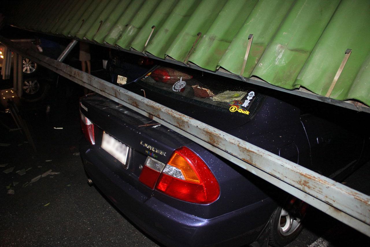 ที่เกิดเหตุเป็นโรงจอดรถสำหรับคณะครูและผู้บริหาร ซึ่งอยู่บริเวณด้านหลังโรงเรียน พบหลังคาโรงจอดรถดังกล่าว โครงสร้างเป็นเหล็กมุงกระเบื้อง ความยาวประมาณ 200 เมตร ถูกลมพายุพัดถล่มจนโครงสร้างหลังคาทรุดตัวทับรถที่จอดอยู่เสียหายทั้งรถเก๋งและรถกระบะจำนวน 26 คัน โดยรถแต่ละคัน ถูกคานเหล็กทับ และกระเบื้องหล่นใส่ได้รับความเสียหายกระจกแตก หลังคายุบ สีถลอก โชคดีขณะเกิดเหตุไม่มีนักเรียนหรือครูอยู่บริเวณดังกล่าว จึงไม่มีผู้ได้รับบาดเจ็บจากเหตุการณ์ในครั้งนี้