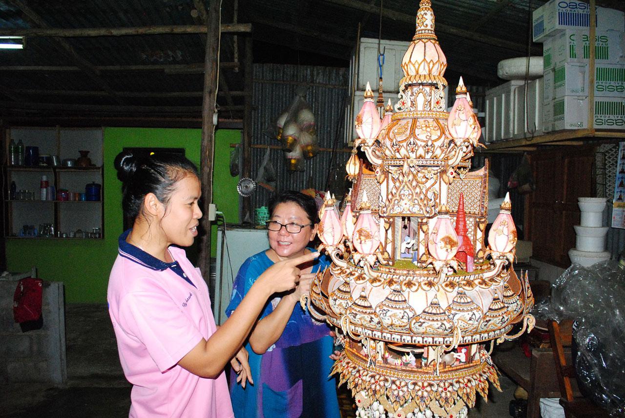 สาวประเภทสองเจ้าของผลงาน เล่าว่า รักสวยรักงามมาตั้งแต่เด็ก เมื่อเข้าศึกษาต่อที่แผนกคหกรรมของวิทยาลัยอาชีวศึกษาสุโขทัย ได้ฝึกฝีมือมาตลอดจนมีความชำนาญ โดยเฉพาะการจัดดอกไม้ รวมถึงการประดิษฐ์กระทงและโคมชักโคมแขวน ซึ่งผลงานทุกชิ้นเน้นความคิดสร้างสรรค์และวัสดุที่หาได้ตามธรรมชาติในท้องถิ่นเป็นหลัก ไม่ว่าจะเป็นเมล็ดธัญพืชต่าง ๆ เช่น ข้าวเปลือก งาดำ งาขาว ใบตอง ไม้ไผ่ ใบลาน เป็นต้น ซึ่งจากการประกวดในงานประเพณีลอยกระทงเผาเทียนเล่นไฟของจังหวัด เกือบทุกปีที่ผ่านมาได้รับรางวัลตลอด