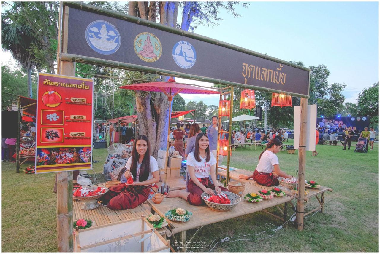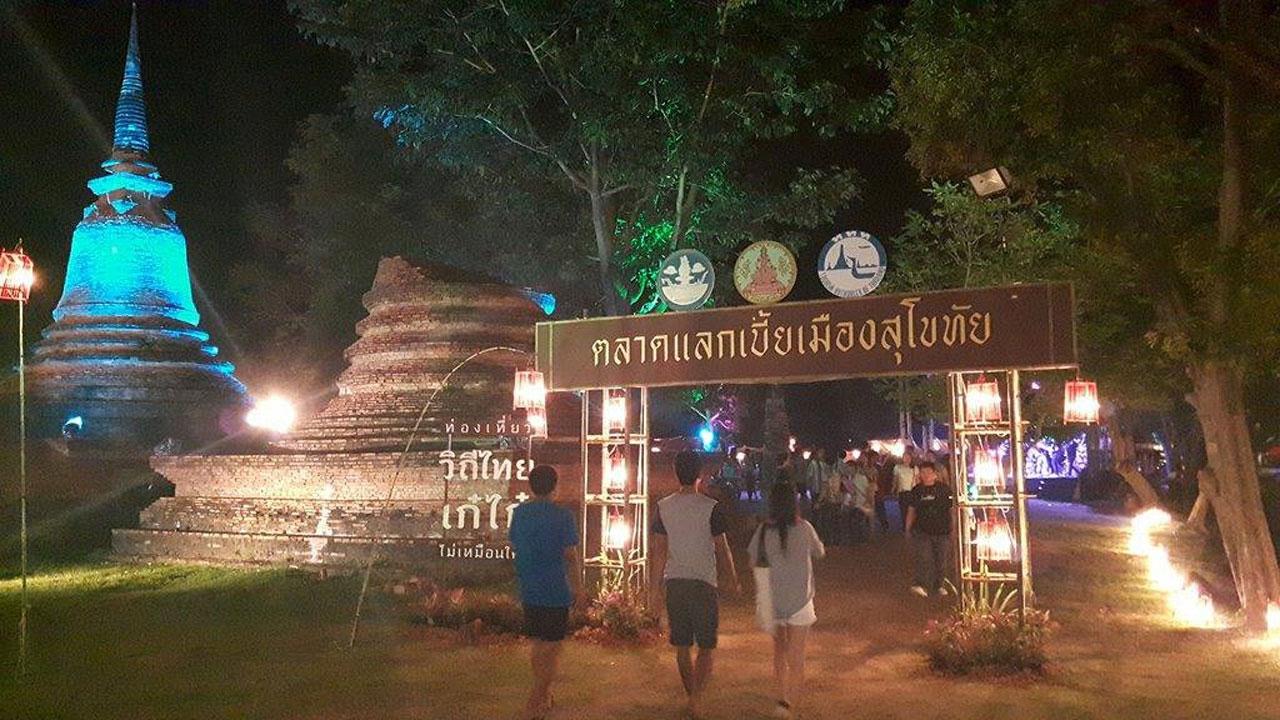 ขณะที่บริเวณศาลาสี่หลัง ภายในอุทยานประวัติศาสตร์สุโขทัย ซึ่งทางจังหวัด จัดให้มีการแสดงตลาดโบราณ(ตลาดแลกเบี้ย) ภายใต้แนวคิด “วิถีสุโขทัย วิถีแห่งสายน้ำ” นับเป็นรูปแบบวิถีชีวิตของชาวสุโขทัยในอดีตที่ผูกพันกับสายน้ำ ซึ่งคือ แม่น้ำยมในปัจจุบัน ได้รับความสนใจจากนักท่องเที่ยวเป็นอย่างมาก สำหรับจุดเด่นของตลาดแลกเบี้ย ต้องใช้เงินสดแลกเป็นเบี้ยก่อน จึงจะนำไปซื้ออาหารคาวหวานที่เคยมีมาแต่ครั้งโบราณ เช่น ข้าวเปิ๊บ ข้าวพัน แกงขี้เหล็ก ขนมกง และน้ำสมุนไพร