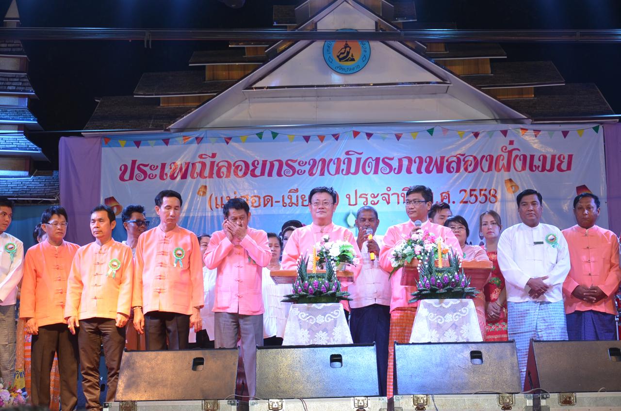 จากนั้น นายสมชัยฐ์ หทยะตันย์ติ ผู้ว่าราชการจังหวัดตาก และนายอูหล่วยกั่วอู ผู้ว่าราชการจังหวัดเมียวดี ประเทศเมียนมา เดินทางไปร่วมลอยกระทงกลางแม่น้ำเมย แม่น้ำศักดิ์สิทธิ์ที่ไหลจากใต้ขึ้นเหนือสายเดียว แห่งเดียวในประเทศไทยเท่านั้น ซึ่งเป็นแม่น้ำที่ใช้แบ่งเขตแดนไทย-เมียนมา ด้วยความชื่นมื่นทั้งสองฝ่าย ท่ามกลางประชาชนทั้งไทยและเมียนมาที่มาร่วมงานอย่างมืดฟ้ามัวดิน จากนั้นเป็นการจุดพลุแสดงแสงสีเสียงอย่างตื่นตาตื่นใจเป็นอันเสร็จพิธีลอยกระทงมิตรภาพสองแผ่นดินร่วมกันเป็นปีที่ 2 ในประวัติศาสตร์