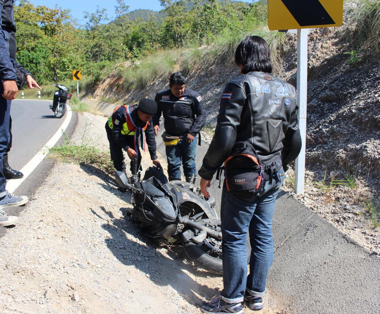 จุดเกิดเหตุเป็นทางโค้ง พบรถจักรยานยนต์บิ๊กไบค์ ยี่ห้อคาวาซากิ สีดำ ไม่ทราบหมายเลขทะเบียน เสียหลักหลุดโค้ง ไถลออกนอกเส้นทาง 1 คัน มีผู้ได้รับบาดเจ็บ 1 ราย ชื่อ นายวงศธร ทะนงค์ อายุ 28 ปี ชาวบ้านย่าน ถ.สมเด็จพระปิ่นเกล้า แขวงอรุณอมรินทร์ เขตบางกอกน้อย กรุงเทพฯ ชุด ชป.ฉก.ทพ.36 จึงนำผู้ได้รับบาดเจ็บส่งเข้ารักษาที่โรงพยาบาลแม่สะเรียง ส่วนสาเหตุคาดว่า ไม่ชำนาญเส้นทางที่มีโค้งใหญ่น้อยจำนวนมาก.