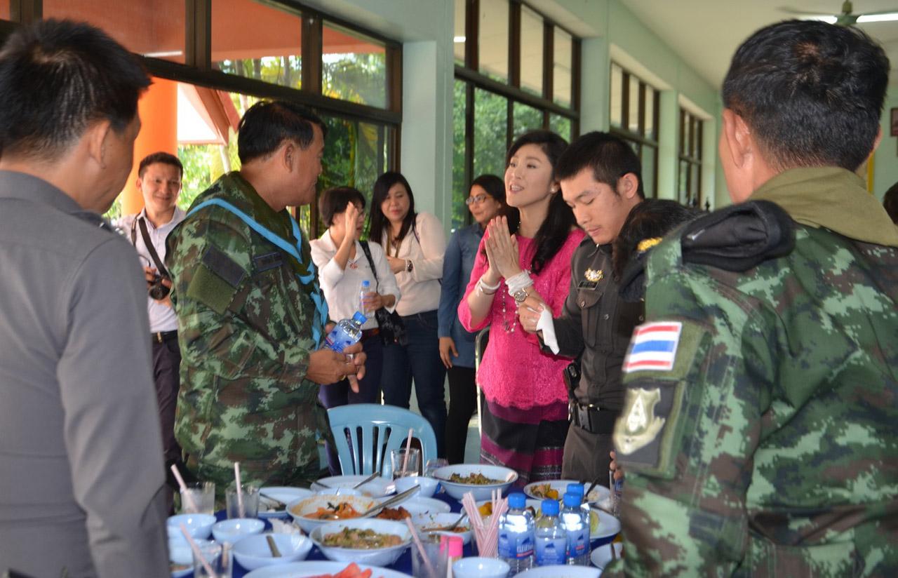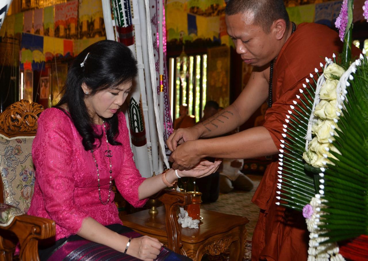 หลังพิธีถวายผ้าป่าเสร็จสิ้น ผู้เฒ่าผู้แก่ได้เข้าผูกข้อมือพร้อมให้ศีลให้พร ให้ น.ส.ยิ่งลักษณ์ผ่านพ้นเรื่องไม่ดีงามในชีวิต และให้ชีวิตเป็นสุข ซึ่ง น.ส.ยิ่งลักษณ์ ได้ไปเดินเวียนเทียนรอบองค์พระเจดีย์ทองภายในวัด พร้อมกันนี้ได้แจ้งความประสงค์จะขอเป็นเจ้าภาพสร้างปราสาทเงินองค์ใหญ่รอบองค์เจดีย์ทอง เป็นเงิน 99,999 บาท จากนั้นเดินทักทายชาวบ้านในบริเวณวัดและร่วมรับประทานอาหารร่วมกับชาวบ้าน ซึ่ง น.ส.ยิ่งลักษณ์ดูใบหน้าอิ่มบุญยิ้มแย้ม ทักทายชาวบ้านรวมทั้งทหารตำรวจที่มาสังเกตการณ์อย่างเป็นกันเอง.