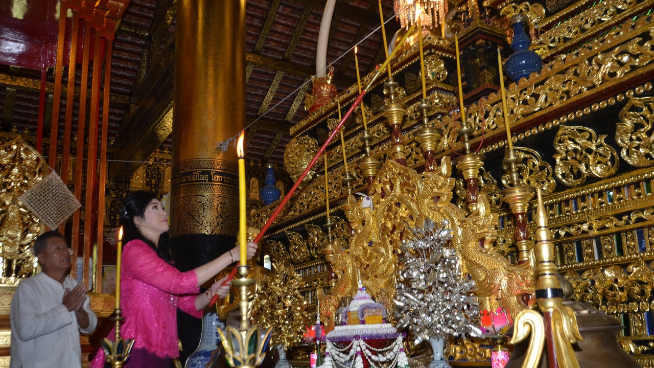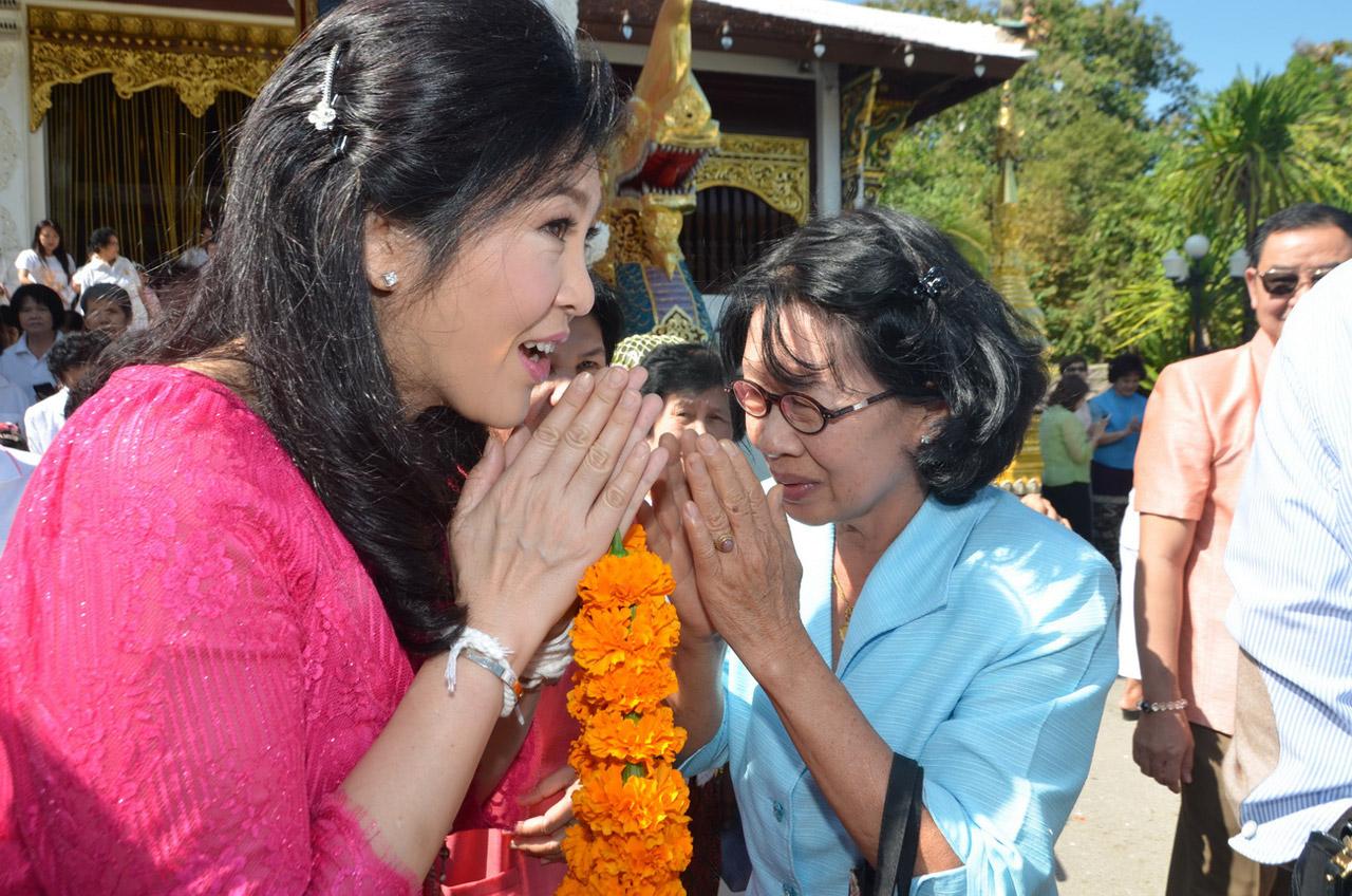 'ยิ่งลักษณ์' พร้อมคณะทำบุญถวายผ้าป่าที่วัดศรีมุงเมือง ต.ลวงเหนือ อ.ดอยสะเก็ด จ.เชียงใหม่ ทางพระครูดังทำพิธีไล่เคราะห์ทั้ง 8 และเติมขวัญ 32 ให้ ขณะที่ ผู้เฒ่าผู้แก่มัดมือให้ศีลให้พร ทำให้ปูยิ้มได้ โดยมี ตร.และทหารคอยจับตา...