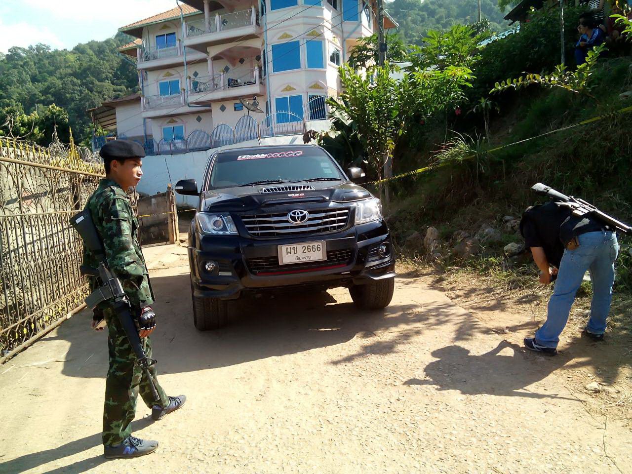 ที่เกิดเหตุ บริเวณทางแยกหน้าบ้านเลขที่ 158 หมู่ 8 พบศพ นายสันติ แสนย่าง อายุ 26 ปี บ้านเลขที่ 436/พ หมู่ 7 ต.ปอ อ.เวียงแก่น สภาพนอนคว่ำบริเวณลานหน้าบ้าน มีบาดแผลถูกยิงด้วยอาวุธปืนที่กลางหลัง 2 แผล รักแร้ขวา 4 แผล มือขวา 1 แผล ที่ปลายเท้าพบอาวุธปืน CZ ปลอกกระสุน 6 ปลอก โทรศัพท์มือถือ 1 เครื่อง ห่างไปประมาณ 1 เมตร พบรถกระบะโตโยต้า วีโก้ สีดำ ทะเบียน ผข 2666 เชียงราย จอดติดเครื่องอยู่ ห่างออกไป 4 เมตร พบรถกระบะอีซูซุ ดีแมกซ์ สีดำ ทะเบียน ผข 5791 เชียงราย จอดหันหน้าเข้าหากัน ข้างประตูคนขับพบศพ นายภาคี อย่างวิจิตร อายุ 27 ปี อยู่บ้านเลขที่ 98 หมู่ 28 ต.ตับเต่า อ.เทิง จ.เชียงราย นอนตะแคงขวา มีบาดแผลถูกยิงเข้าที่หน้าผาก 1 แผล และ นายสัว แซ่ว่าง อายุ 18 ปี อยู่บ้านเลขที่ 106/ช หมู่ 9 ต.ปอ อ.เวียงแก่น ถูกยิงที่สะโพกได้รับบาดเจ็บ มีผู้นำส่ง รพ.เชียงรายประชานุเคราะห์ เจ้าหน้าที่ได้ประสาน สภ.เมืองเชียงราย เข้าเฝ้าระวัง