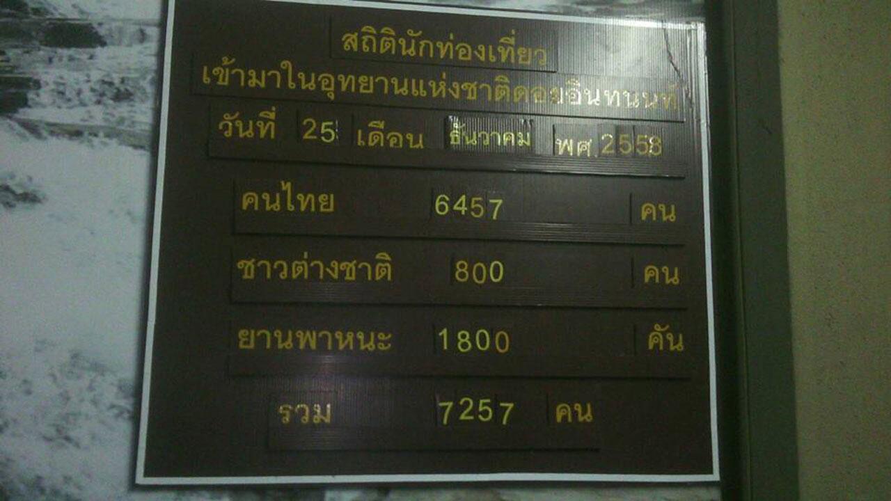 เมื่อเวลา 08.30 น.วันที่ 26 ธ.ค. นายพรเทพ เจริญสืบสกุล หัวหน้าอุทยานแห่งชาติดอยอินทนนท์ เปิดเผยว่า อุณหภูมิยอดดอยเช้าวันนี้ที่ดอยอินทนนท์ บนยอดหญ้าวัดได้ 9 องศาเซลเซียส สภาพอากาศปิดหมอกลงหนาจัด นักท่องเที่ยวยังคงแห่ขึ้นมาสัมผัสอากาศหนาว และรอชมพระอาทิตย์ยามเช้า รอชมทะเลหมอกอย่างไม่ขาดสายแน่นทั้งวัน วันนี้ไม่มีฝนตก ถึงแม้อุณหภูมิจะเพิ่มขึ้นสถิตินักท่องเที่ยวเมื่อวันที่ 25 ธค. ที่ผ่านมา นักท่องเที่ยวยังคงมาเที่ยวจำนวนมาก จากสถิติคนไทย 6,457 คน ชาวต่างชาติ 800 คน ยานพาหนะ 1,800 คัน รวมนักท่องเที่ยวไทยต่างชาติ 7,257 คน สถิติไม่ลดลง และคาดว่าช่วงเทศกาลส่งท้ายปีเก่าต้อนรับปีใหม่ที่จะถึงอีกไม่กี่วันข้างหน้าจะหนาแน่น วันละไม่ต่ำกว่าหมื่นคน