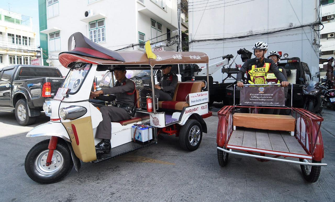 ภาพน่ารักๆของตำรวจถีบรถซาเล้งตรวจตราไปท้องถนนในเขตพระนคร กรุงเทพฯ ถูกแชร์กันอย่างกว้างขวางในโลกโซเชียลด้วยความชื่นชม ที่มาที่ไป พ.ต.ท.สมเกษม จารักษ์ รอง ผกก.จร.สน.สำราญราษฎร์ ให้ข้อมูลว่าจัดทำโครงการ “จักรยานสายตรวจ รถซาเล้งสายตรวจ และรถตุ๊กตุ๊กสายตรวจ” ช่วงแรกใช้จักรยานออกตรวจเน้นตรวจยึดการนำสิ่งของวางขวางพื้นที่สาธารณะ แต่ไม่สามารถยึดได้เพราะรถกระบะหลวงอยู่ระหว่างซ่อมแซม จึงใช้รถซาเล้งที่ซอกแซกตามตรอกซอกซอยได้ง่ายมาใช้เก็บกวาดสิ่งของบนทางเท้ามาดำเนินคดีที่โรงพัก ส่วนรถตุ๊กตุ๊กก็ใช้เป็นรถสายตรวจตามซอยต่างๆ แถมยังรับส่งนักท่องเที่ยวฟรีจนเป็นที่ชื่นชอบ ถูกแชร์จนโด่งดังบนโลกโซเชียล ซึ่งต้องนับว่าเป็นไอเดียบรรเจิดของผู้พิทักษ์สันติราษฎร์ ส่วนโรงพักไหนจะเอาไอเดียแบบนี้ไปใช้ ไม่ผิดกติกาแต่อย่างใด.