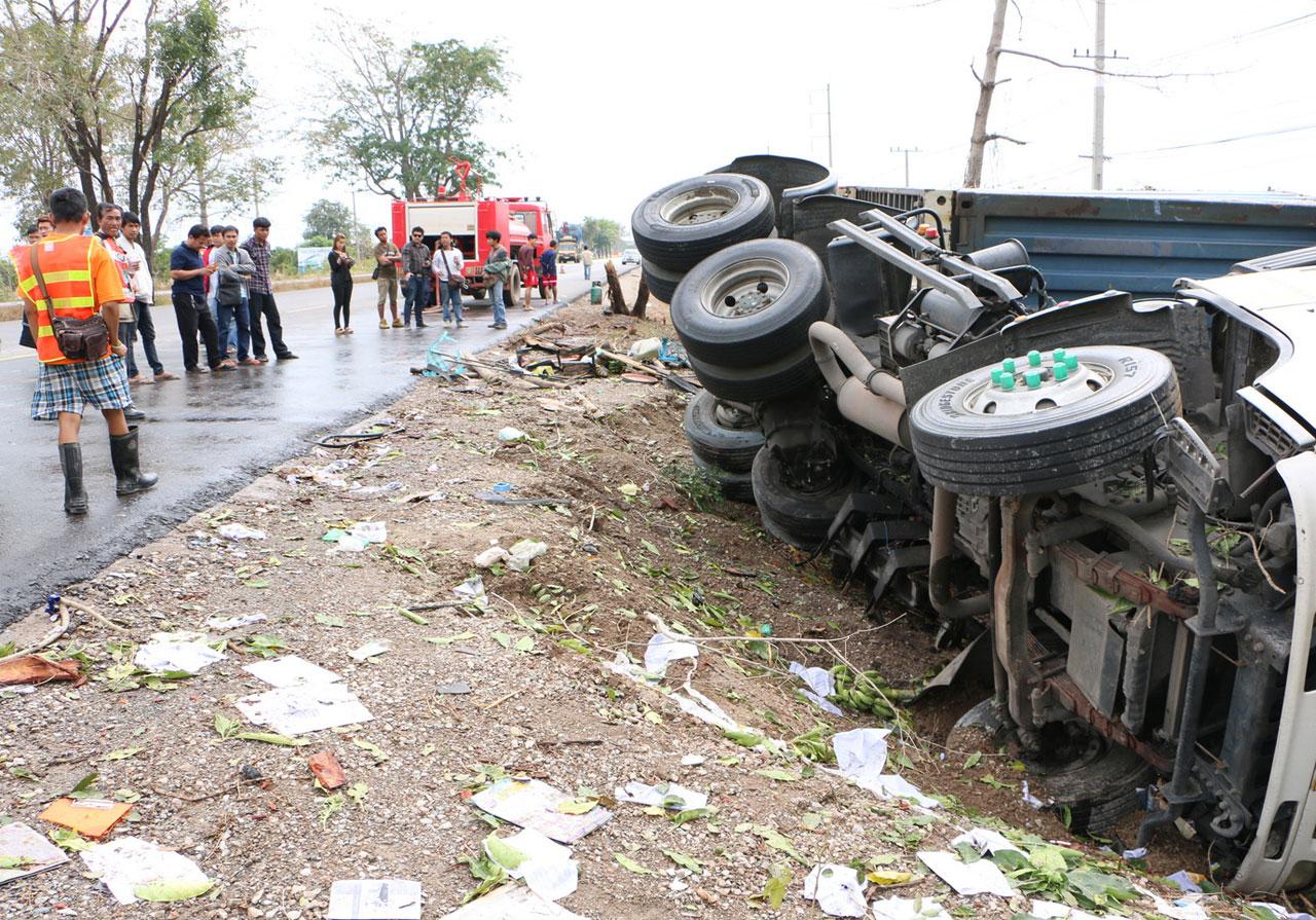 ตรวจในที่เกิดเหตุ พบร่องรอยรถบรรทุก เริ่มตกลงข้างถนนห่างจากจุดที่คว่ำประมาณ 20 เมตร ชนต้นไม้ใหญ่หักไป 1 ต้น จากนั้นมาเสียหลักพลิกคว่ำทับร้านขายกล้วยแขก โดยมีรถจักรยานยนต์ ซึ่งจอดอยู่ในร้าน พังเสียหายไปอีก 1 คัน ส่วนรถบรรทุกพ่วงด้านหน้าพังยับเยิน