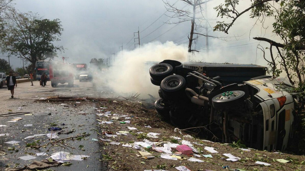 รถพ่วงตู้คอนเทนเนอร์ เสียหลักพลิกลงข้างทางที่กำแพงเพชร ทับร้านขายกล้วยแขกเกิดไฟลุกไหม้ ผัวเมียเจ้าของร้านถูกลวกหนังลอกเป็นแผ่นคล้ายถุงเท้า อาการสาหัส ส่วนคนขับบาดเจ็บไม่มาก คาดหลับใน...