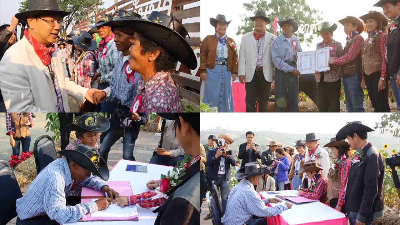 14 คู่รัก ร่วมจดทะเบียนสมรส ในการจัดงาน 'บอกรักที่ม่อนทานตะวัน มนต์รักดอกคำใต้' ครั้งที่ 3 เนื่องในเทศกาลวันแห่งความรัก 14 กุมภาพันธ์ 2559 ที่บริเวณม่อนทานตะวัน ตำบลป่าซาง แต่งกายสไตล์คาวบอย คาวเกิร์ล นั่งรถไถ ชมทุ่งทานตะวัน