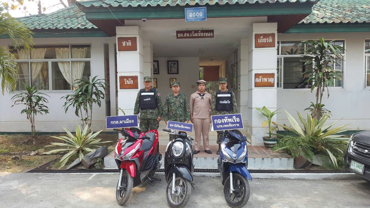 เมื่อวันที่ 19 ก.พ. น.อ.ชลทัย รัคนเรือง ผบ.นรข.เขตเชียงราย และ น.ท.นันทพล นาคสุวรรณหน.ยก.ขว.นรข.เขตเชียงราย ได้รับรายงานว่า จะมีการลักลอบนำรถจจักรยานยนต์ส่งขายประเทศเพื่อนบ้าน โดยไม่ผ่านพิธีการของศุลกากร ด้านพื้นที่ อ.เวียงแก่น จึงสั่งการให้ น.ต.จาตุรงค์ ขจรฟุ้ง หัวหน้าสถานีเรือเชียงของ จัดชุดเข้าซุ่มตรวจบริเวณป่าข้าวโพดริมฝั่งแม่น้ำโขง ใกล้จุดผ่อนปรนบ้านแจมป๋อง ต.หล่ายงาว อ.เวียงแก่น ตั้งแต่เวลา 20.00 น.