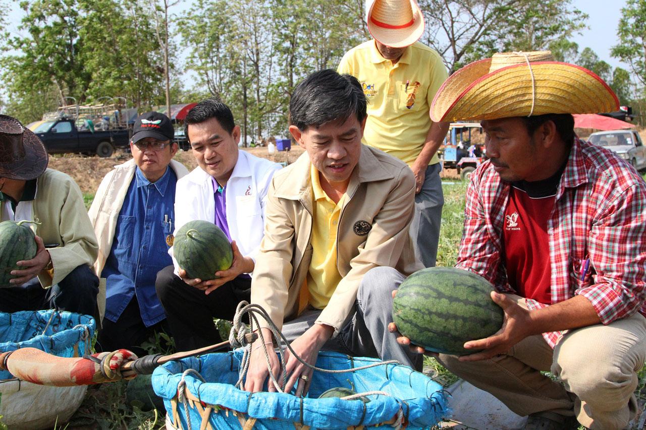 วันที่ 29 ก.พ. 59 ที่แปลงเกษตรสวนแตงโม ริมถนนสายน้ำอ่าง-บ้านแก่ง หมู่ 8 บ้านไร่น้อย ต.น้ำอ่าง อ.ตรอน จ.อุตรดิตถ์ นายสุรศักดิ์ เจริญศิริโชติ ผู้ว่าราชการจังหวัดอุตรดิตถ์ พร้อมด้วย นายอำนาจ ปาลาศ เกษตรจังหวัดอุตรดิตถ์ ลงพื้นที่ตรวจเยี่ยมแปลงเกษตรสวนแตงโม ของ นายพิเชษฐ เคน้ำอ่าง ที่พลิกผันตัวเองด้วยการงดปลูกข้าวทำนาปรัง เนื่องจากประสบปัญหาภัยแล้ง ตามคำแนะนำของเจ้าหน้าที่เกษตรด้วยการหันมาปลูกแตงโมพันธุ์กินรีและพันธุ์ตอร์ปิโด บนพื้นที่นาของตัวเอง เนื้อที่ 20 ไร่